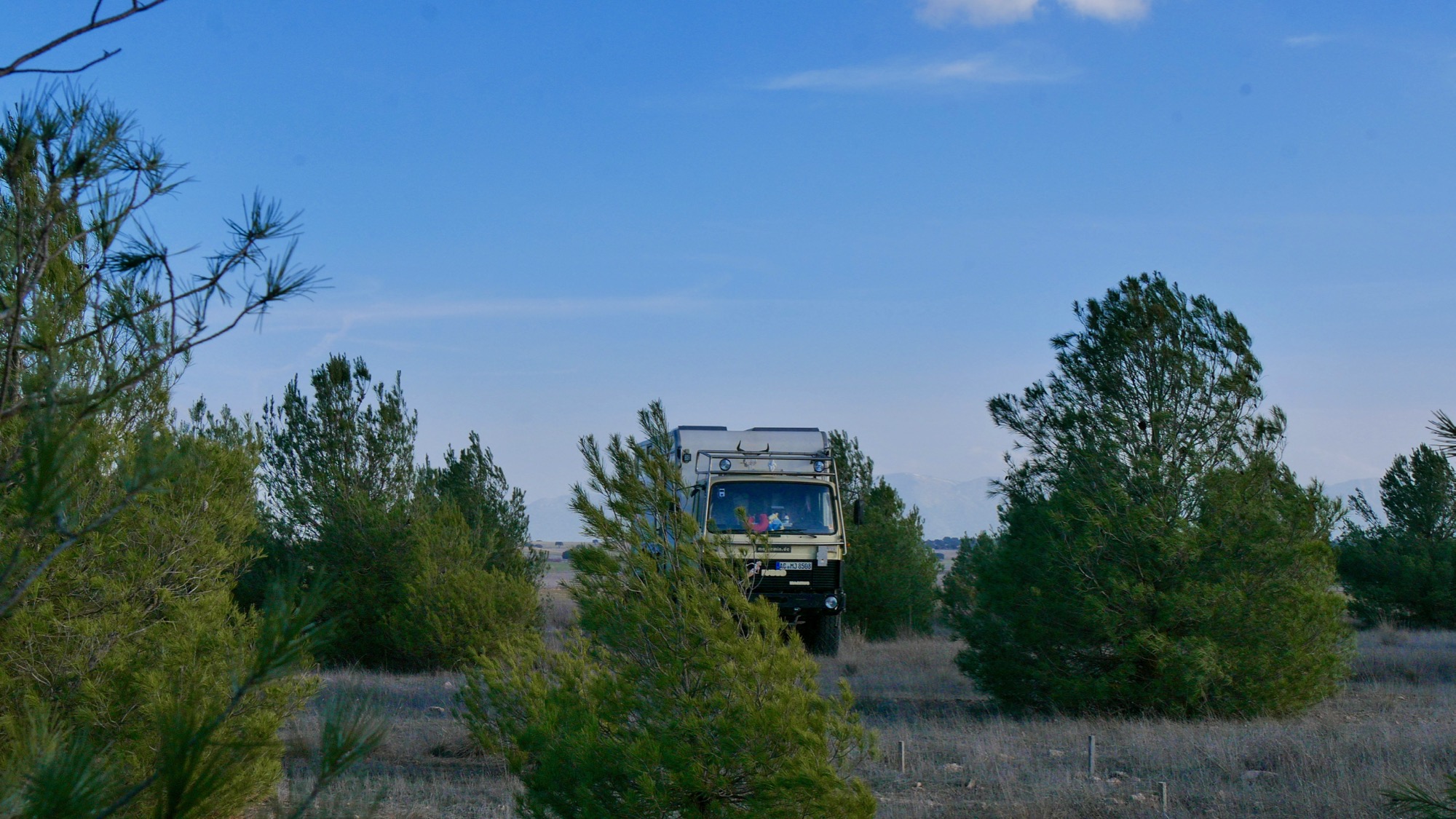 Die Fahrt zum Weihnachtstreffpunkt in der Sierra de Alhamilla führt entlang des Cabo de Gata, am Vulkankrater bei Nijar vorbei. Wir berichteten zuvor über die Region, siehe Nordschleife Leider sind alle Zugänge zu den schönen Plätzen an den Filmkulissen versperrt. In der Ramla del Arcos findet sich dann doch noch ein nettes Fleckchen. Heiligabend vertreiben uns dicke Nebelschwaden, die das Meer von Almeria aus in die nahen Berge schickt. Weiter nordwärts, in der Wüste von Tabernas, ist es trocken und klar. Doch leider sind auch hier alle Zugänge ins riesige Gelände verboten, versperrt. Seltsam, auch Radfahrer und Fußgänger scheitern immer wieder an Ketten und Tafeln, die auf Privatgelände hinweisen. Etwas außerhalb findet sich auf der Hochebene ein wunderbares Areal mit Weitsicht in die Berge für unser kleines Rudel aus drei LKW, sechs Menschen und einem Hund. Weihnachten mit Freunden unterm klaren Sternenzelt. Milchstraße! Stille Nacht, Heilige Nacht. Ruhe im Innern,