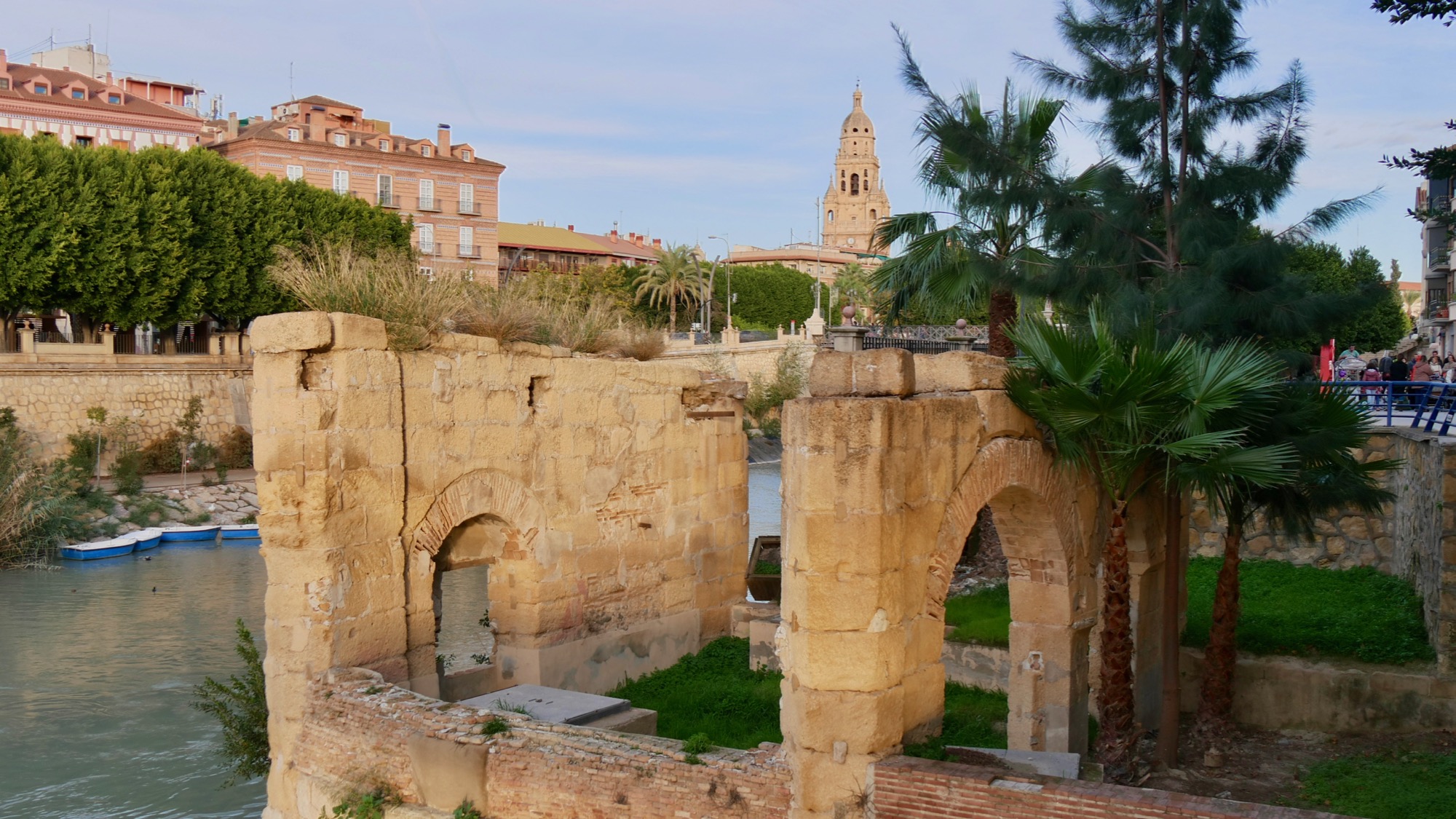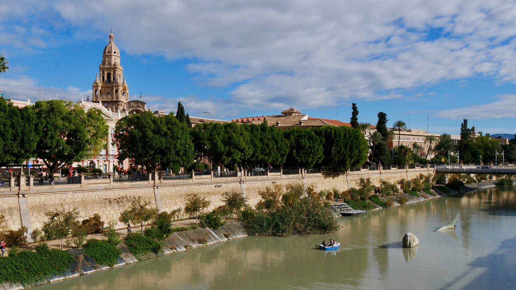 Nach drei Anläufen findet sich fußläufig zu Murcias Innenstadt, am GR 127 Rio Segura, Platz für Ive. Das Auge, mittlerweile geübt im Ausblenden von Schutt und Müll, blickt auf die nahe Altstadt. Entlang des Flusses stadtauswärts Gassiwege für Minouk. Siebtgrößte Stadt im Staat, Sitz der drittältesten Universität, Hauptstadt der gleichnamigen Provinz. Trockenste Region und gleichzeitig Gemüsegarten Europas, dank ausgefeilter Bewässerung aus den Bergen – Murcia liegt am Ausläufer der Sierra Nevada – deren Grundlage die Mauren schufen. Erstaunlich überschaubar präsentiert sich die schöne Altstadt mit ihrer Fußgängerzone. Zwischen dem Rathaus an der Glorieta de Espagna, der Kathedrale mit Bischofspalast und, wie könnte es anders sein, mit Krippe, sowie dem Plaza Santo Domingo liegt nur rund ein Kilometer. Abstecher zum Theater, der Halle des Mercado Victorias. Auch in der Großstadt schließen nachmittags Geschäfte, Kirchen, Museen… Spanier verbringen die Zeit meist in Bars. Vor allem am Wochenende pulsiert dann hier das Leben, bevor es wieder „in den Job geht“. Pech einerseits für Touristen, die sich nicht zwischen 13:00 Uhr und 17:00 Uhr der Völlerei, sondern dem sight seeing hingeben möchten. Denen meist ein Milchkaffee genügt, um nicht der nachmittäglichen Verdauungsträgheit zu erliegen. Die spanische Gewohnheit der Siesta wird uns fremd bleiben. Andererseits ist die verordnete Zwangspause, insbesondere wochentags, auch vielen Spaniern ein Dorn im Auge, stiehlt sie Zeit, die dem Feierabend, der Familie fehlen. (ADAC Tourenpaket, Murcia)