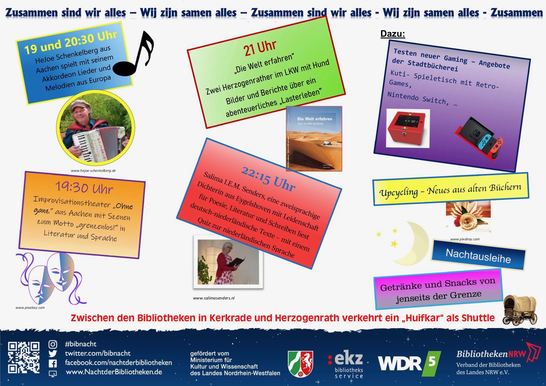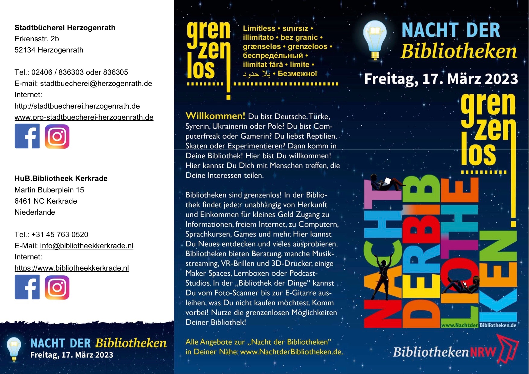 Wir sind geladen, am 17.03.2023 einen Vortrag zur 10. Nacht der Bibliotheken NRW zu halten. Denn 2023 heißt das Motto ´grenzenlos´ und man ist überzeugt, wir könnten gut zum Thema berichten. Leider weilen wir dann noch nicht in Herzogenrath. Unsere Reisefreunde Christiane und Alex bieten sich an, die bildbegleitete Rede zu übernehmen. „Das macht doch Spaß“ meint Christiane, als ich sie mit etwas schlechtem Gewissen um diesen Gefallen bitte. Also, an alle, die in Herzogenrath weilen, denen der Weg dorthin nicht zu weit ist und denen nach spannender Unterhaltung ist: Am 17.03.23 gibt es dort den kurzweiligen Event ´grenzenlos´!