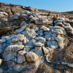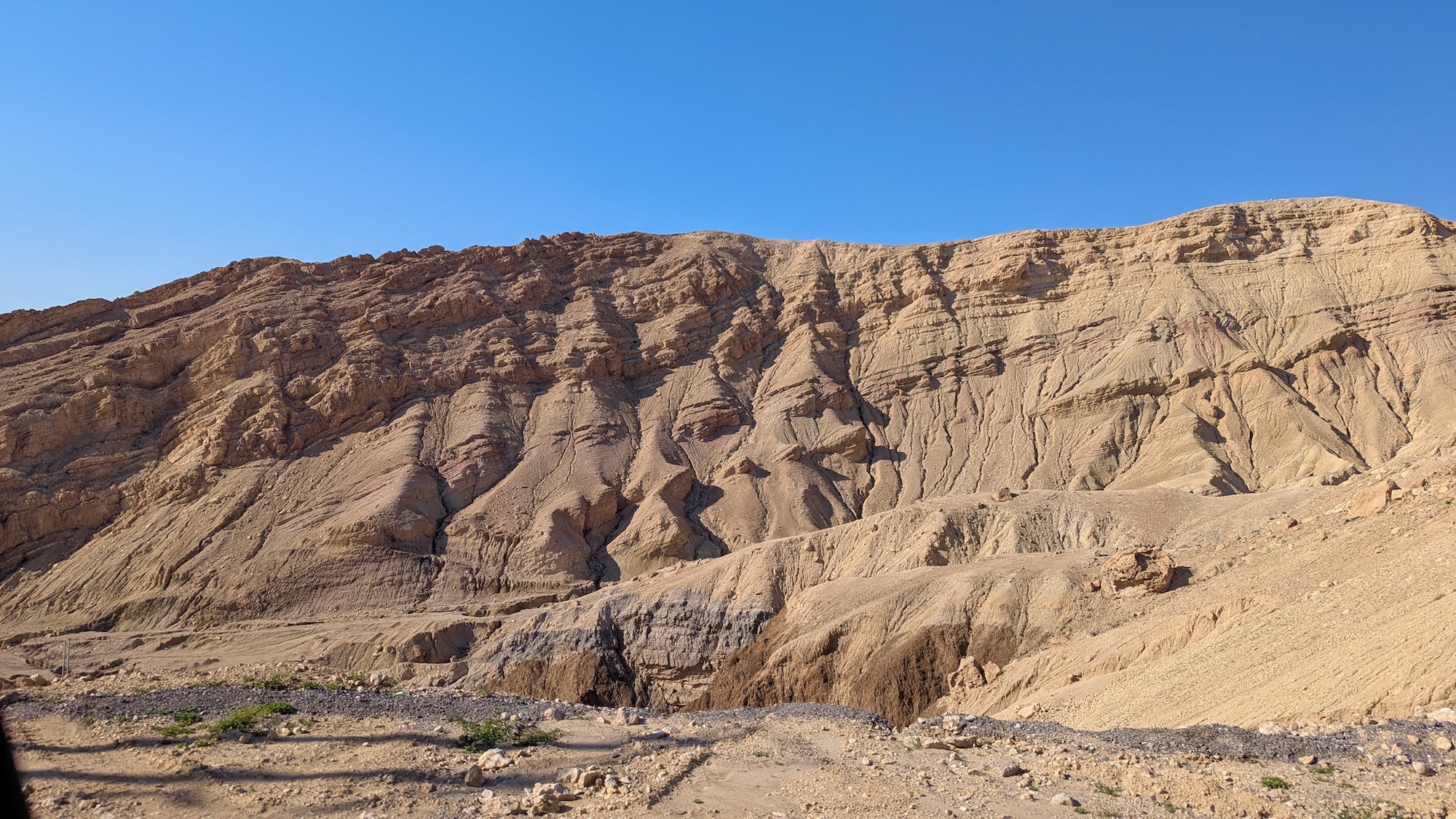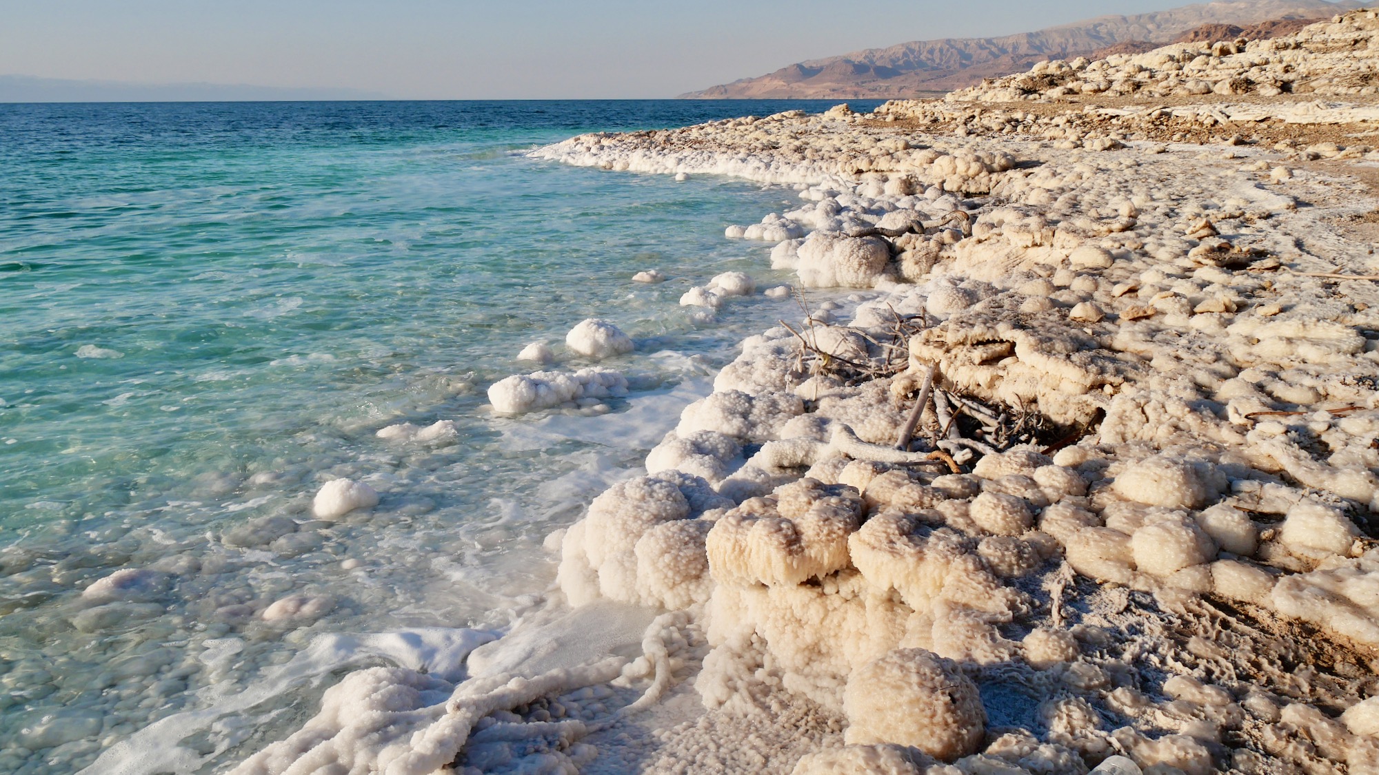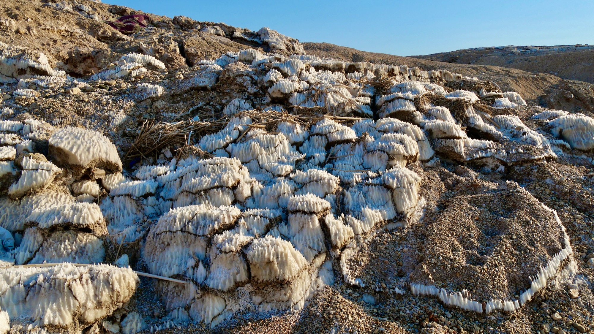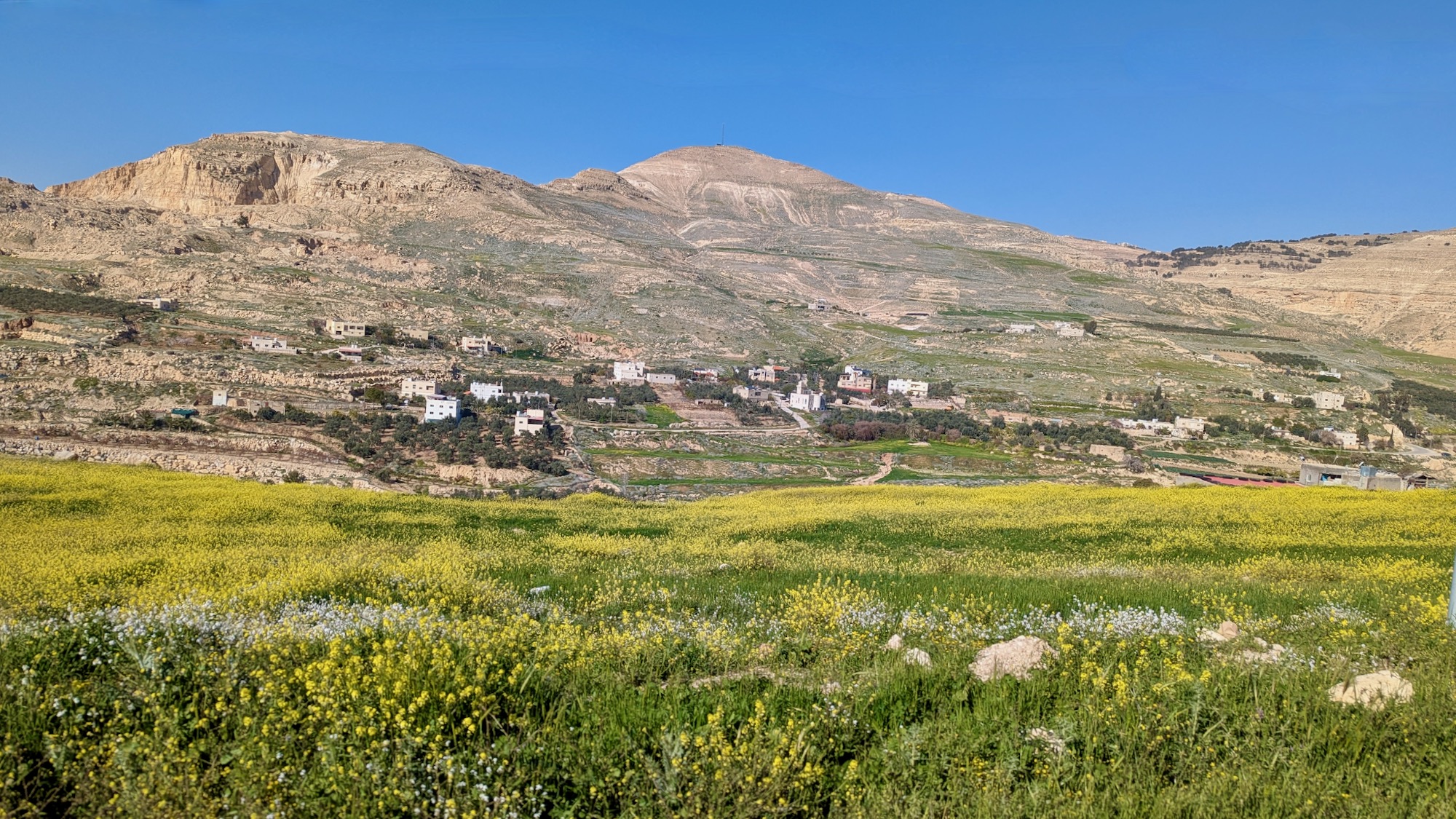 Wir wählen die kleine Landstraße 35 nordwärts, die zwischen den beiden großen Highways durch die Berge verläuft. Faszinierende Landschaft, Dörfer und kleine Städte entlang des Weges, Menschen winken, grüßen. Am Straßenrand reihen sich Obst- und Gemüsestände, Werkstätten aneinander, ein lebendiger Streckenabschnitt. Grüne Felder. Bäume und Blumen blühen. Der Frühling hält Einzug. Gäbe es keine Nachrichten, wir kämen niemals auf die Idee, dass Menschen im Krieg sind. Auf dem bewachten Strandparkplatz am Toten Meer beim Wadi al Sheqeiq sind wir zur Nacht willkommen. Das Navigationssystem weist -370 m aus, wir blicken auf den am tiefsten gelegenen See der Welt! Das Tote Meer, eigentlich ein abflussloser See, wird maßgeblich vom Jordan gespeist, ist extrem salzhaltig und befindet sich am Nordende des großen afrikanischen Grabenbruchs.