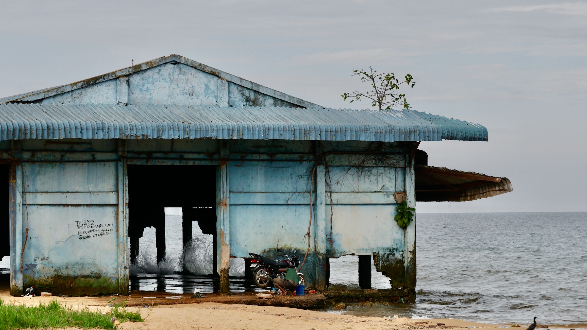 Wir fahren westlich des Sees durch wunderschönes Hochland Richtung Uganda. Malerisch ist die Landschaft selbst im leichten Regen, im Nebel, vielleicht gerade deswegen. Regenwald, Dschungel, gigantische Plantagen exotischer Südfrüchte, Garten Eden und doch weit entfernt vom Paradies. Eine Selbstversorgerfamilie gewährt uns Nachtplatz neben der T4. In Bukoba, das neben dem See ein paar Sehenswürdigkeiten bietet und für afrikanische Verhältnisse recht sauber ist, gibt es auf dem Gelände der Beach Bar direkt neben deutschen Überresten Platz für uns. Davon demnächst.