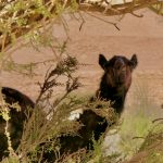 Auf unserer langen Wanderung erspähen wir weder Steinböcke noch die scheuen Wölfe, ebensowenig große Greifvögel. Dafür sehen wir bei der Rückkehr wieder einen Ranger. Also, was wir tun ist verboten, erklärt er freundlich. Campen, Feuer machen, betreten des Geländes ohne Permit. Zu Letzterem zeigt Jürgen die Fotos der Seiten auf arabisch, Feuer haben wir (noch) keins gemacht und dass campen verboten ist, steht nirgendwo, noch nicht mal, dass wir überhaupt im Park sind, bzw. ein Permit nötig ist, nix! Ja, die Regeln in Saudi Arabien erlauben freies Campen fast überall, aber eben nur fast, und hier nun mal eben nicht. Er begleitet uns hinaus aus dem Terrain. Auch jetzt sehen wir nirgends Hinweis- bzw. Verbotsschilder. Am nahen Staudamm von Al Hulwah, umgeben von zahlreichen Oscherbüschen (Sodomsapfel), bleiben wir zur Nacht.