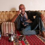 Weiter südlich bei Imnkhli stöbern wir mit Ive einen Weg in die Wüste auf. Sand, in immer wieder neuen Bildern. Weich, fließend, wie flüssiges Gold. Kantig, hart, bizarr. Gleißendes Licht, flirrende Luft, Strukturen verschwinden im Nebel der Helligkeit. Fordernd, aber auch meditativ. Wie die Zentralsahara und die Atacama gehört die Rub al Khali zu den echten Wüsten, nahezu ohne Leben. In der hyperariden Region ist Wasser eine Rarität. Ein Glas Wasser® auf seinem Weg in der Welt (Aktion mit/von der Künstlerin Heike Krüger und Stefan Cotinghui, ich berichtete öfters über die Aktion), Luxus und gleichzeitig Lebensnotwendigkeit. Doch Ives Tanks sind leer. Aufbruch und das Wasser-Glas zieht mit, in der Hoffnung, dass für uns bald wieder mehr als ein Glas Wasser draus wird. Tief im Süden des KSA, dort wo sich der Highway 15 ostwärts in den Jemen, dem Hadramaut, und westlich zum Roten Meer hin wendet, erspäht Jürgen einen Wasserturm, der in Funktion zu sein scheint. Keiner zu hause? Wir wollen schon wieder fahren, da kommt jemand auf uns zu. Klar können wir Wasser haben, lautet die Antwort auf Jürgens Frage. Wie üblich ist der Stutzen zur Füllung der Wassertanker für Ives Anschlüsse zu groß. Aus dem Bassin, das mittels Pumpe mit Grundwasser gespeist wird, bedienen wir uns. Hernach geht Jürgen sich zu verabschieden, fragt nach dem Wasserpreis … Nein, so einfach kommen wir nicht davon. Wir sind an einem Verkehrssicherheitsposten, der Gruppenleiter möchte uns sehen, dies und das erfahren. Das geht nicht ohne Kaffee, wunderbar aromatisiert mit Kardamom, etwas Milch, leicht scharf, dazu süße Datteln und Kommunikation mit Händen und Füßen, ein wenig englisch dazu. Jedenfalls wird klar, dass der Leiter der Station uns nach dem Kaffee in sein Büro bittet, um uns kennenzulernen. Der Bruder des Leitenden wird angerufen, der spricht gut englisch und so kommt ein informatives Gespräch zustande. Die Gruppe erfährt von unseren umfangreichen Reisen, wir erfahren, dass es gleich Lunch für uns gibt, wir unbedingt in die Berge fahren sollen, den Bruder besuchen. Das liegt auf unserem Weg, Telefonnummern werden ausgetauscht. Wenn wir irgendwelche Probleme haben, müssen wir anrufen! Nach dem Essen darf Tee nicht fehlen, der Raum wird mit Myrrhe geräuchert, Gespräche über Weltpolitik geführt. Glatteis in der Wüste, da möchte ich jetzt doch lieber langsam aufbrechen. Nein, nein: wunderbar aromatische Nelken, eine dicke, süße Zimtstange, sterile Wundgazen, zwei Instant-Warm-Kalt-Kompressen sowie etliche kleine Flaschen Wasser werden als Wegpräsente eingepackt. Ach ja, der Stationsleiter weist wiederholt darauf hin, dass der LKW Diesel braucht … Jürgen gibt sich geschlagen, und so wird letztlich auch noch Ive mit 200 l gefüttert. Zum Abschied überreicht mir Mubarak seine rot-weiße Kopfbedeckung, den Shemagh. Überwältigt von der Gastfreundschaft ziehen wir von dannen, verlassen ca. 80 km später den Highway 15 in die Wüste zur Nacht. Das Abendbrot fällt weitgehend aus.