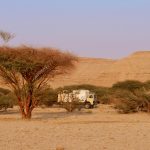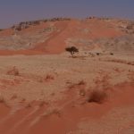 Teepause in wunderschön geschwungener Sicheldünenlandschaft; ich will nicht verschweigen, dass über längere Strecken flaches Ödland zu bewältigen ist. Nach 360 km biegen wir zur Nacht nahe Al Haddar ab, Akazien lockern die Felslandschaft auf.