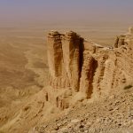 Und tags drauf fahren wir an den Rand der Welt, Edge of the world, auch Jebel Fihrayn genannt, nordwestlich von Riad. Das Felsspektakel ist Teil der wunderschönen Tuwaiq-Berge. Lässt der Name vermuten, dass der blaue Planet doch eine Scheibe ist und der Weg spannend? Nein, tief unten im Tal gehts weiter, und mit Ives Bodenfreiheit ist der Weg überwiegend nur nervig! Dafür belohnt spektakuläre Landschaft mannigfach. Kälte, Wind, der sie scheinbar verstärkt, lässt uns nach zwei Nächten die Berge verlassen.