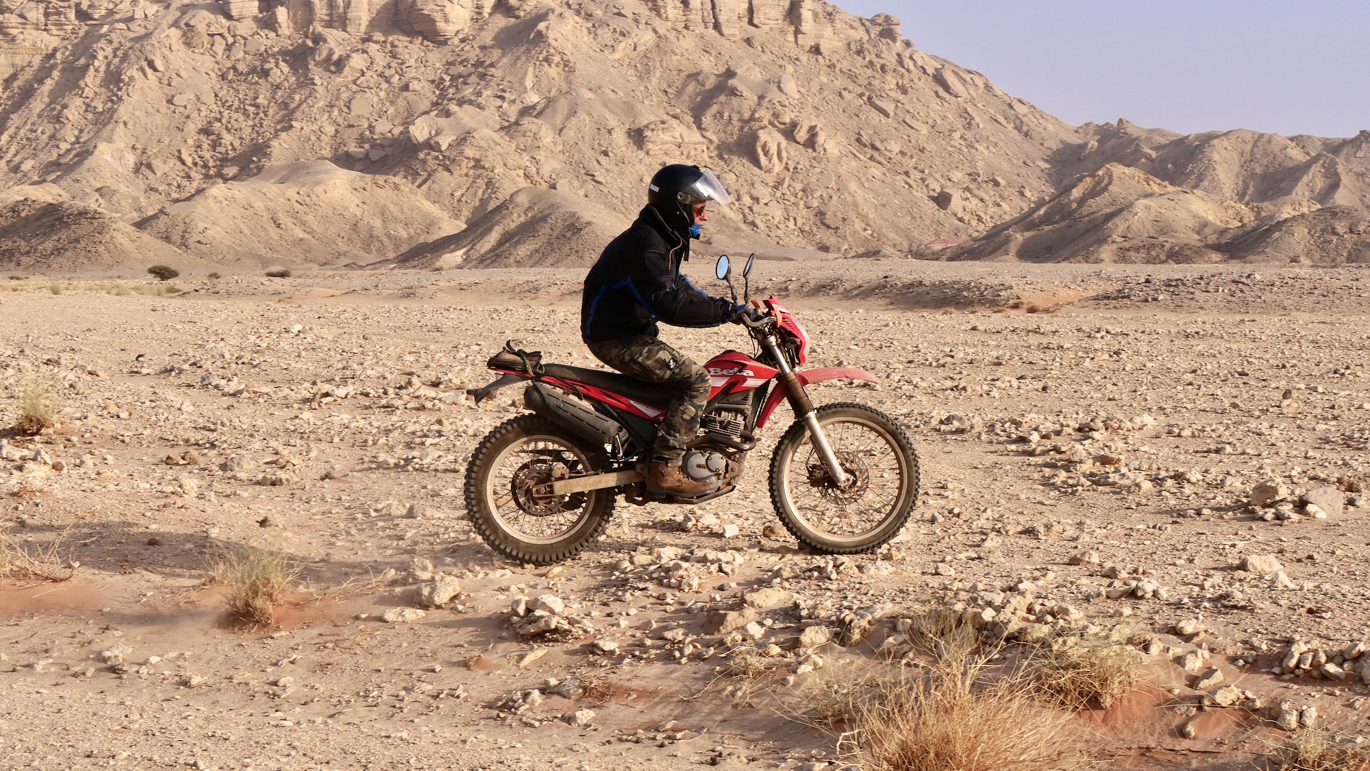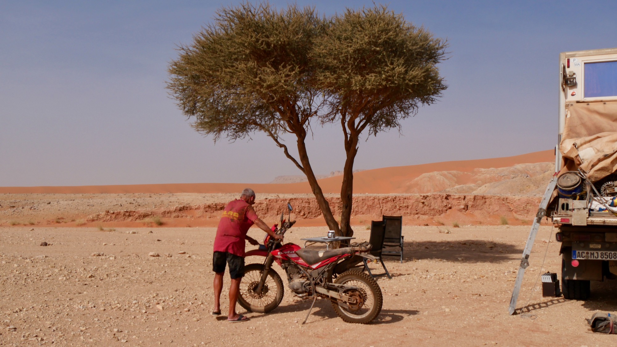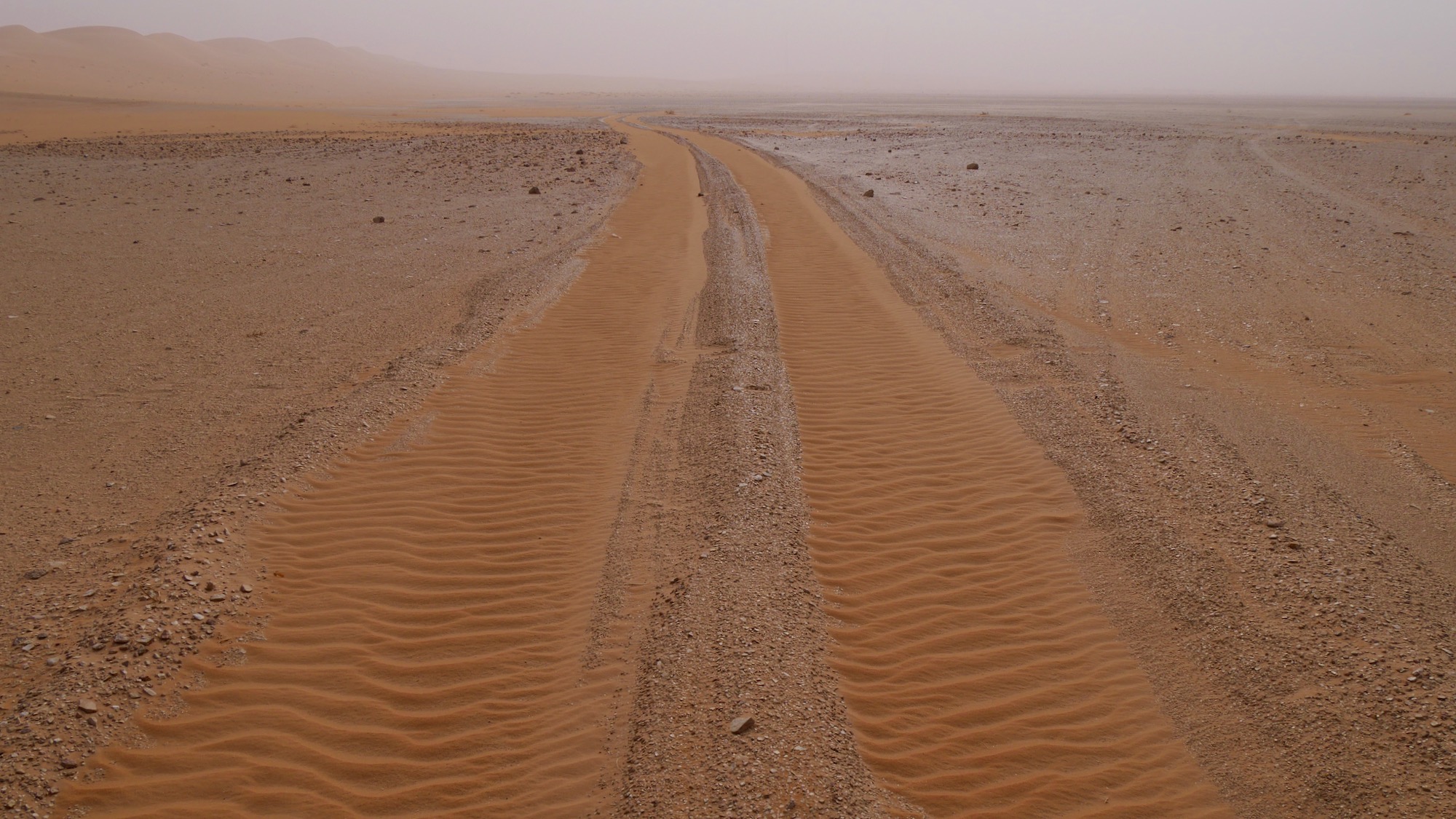 23.01. – 29.01.2026 Eine Woche verbringen wir in der Rub al Khali. Zunächst am Rande des UNESCO Weltnaturerbes Uruq Bani Maárid. Jürgen lädt sein Motorrad von der Bühne, entstaubt, päppelt die Batterie und findet dann über Schotterebenen, entlang der Felsausläufer, ab und an im losen Sand seinen Spaß!