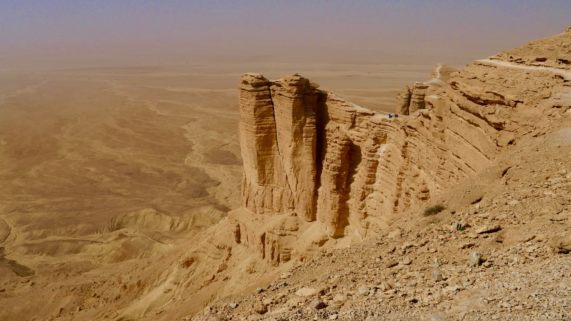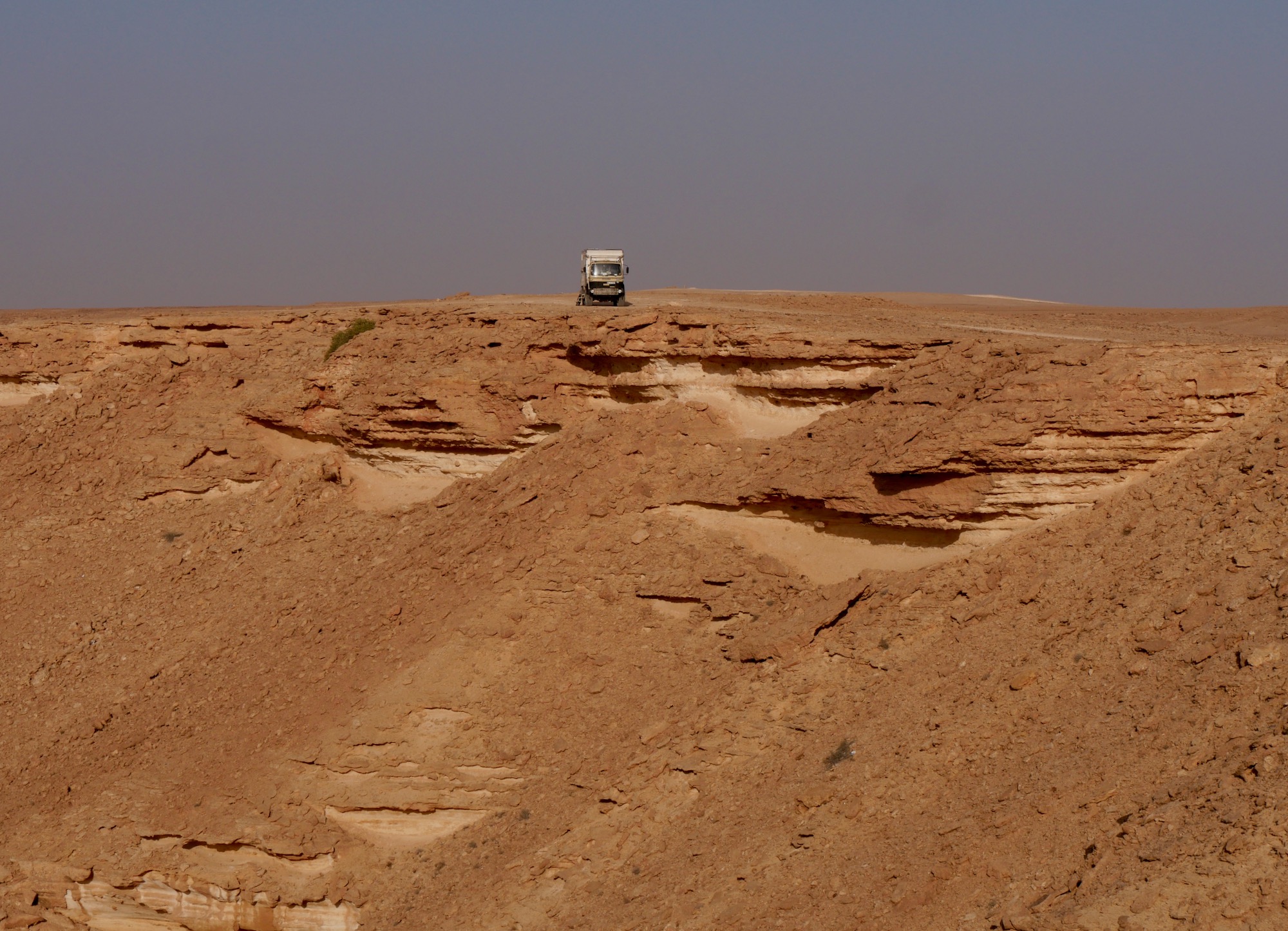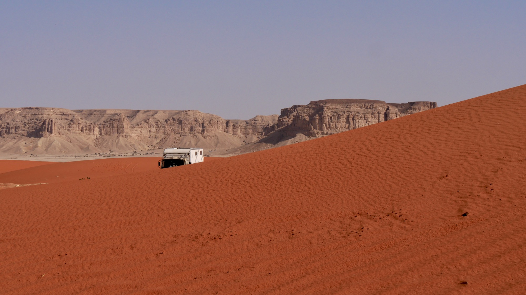 Und tags drauf fahren wir an den Rand der Welt, Edge of the world, auch Jebel Fihrayn genannt, nordwestlich von Riad. Das Felsspektakel ist Teil der wunderschönen Tuwaiq-Berge. Lässt der Name vermuten, dass der blaue Planet doch eine Scheibe ist und der Weg spannend? Nein, tief unten im Tal gehts weiter, und mit Ives Bodenfreiheit ist der Weg überwiegend nur nervig! Dafür belohnt spektakuläre Landschaft mannigfach. Kälte, Wind, der sie scheinbar verstärkt, lässt uns nach zwei Nächten die Berge verlassen.