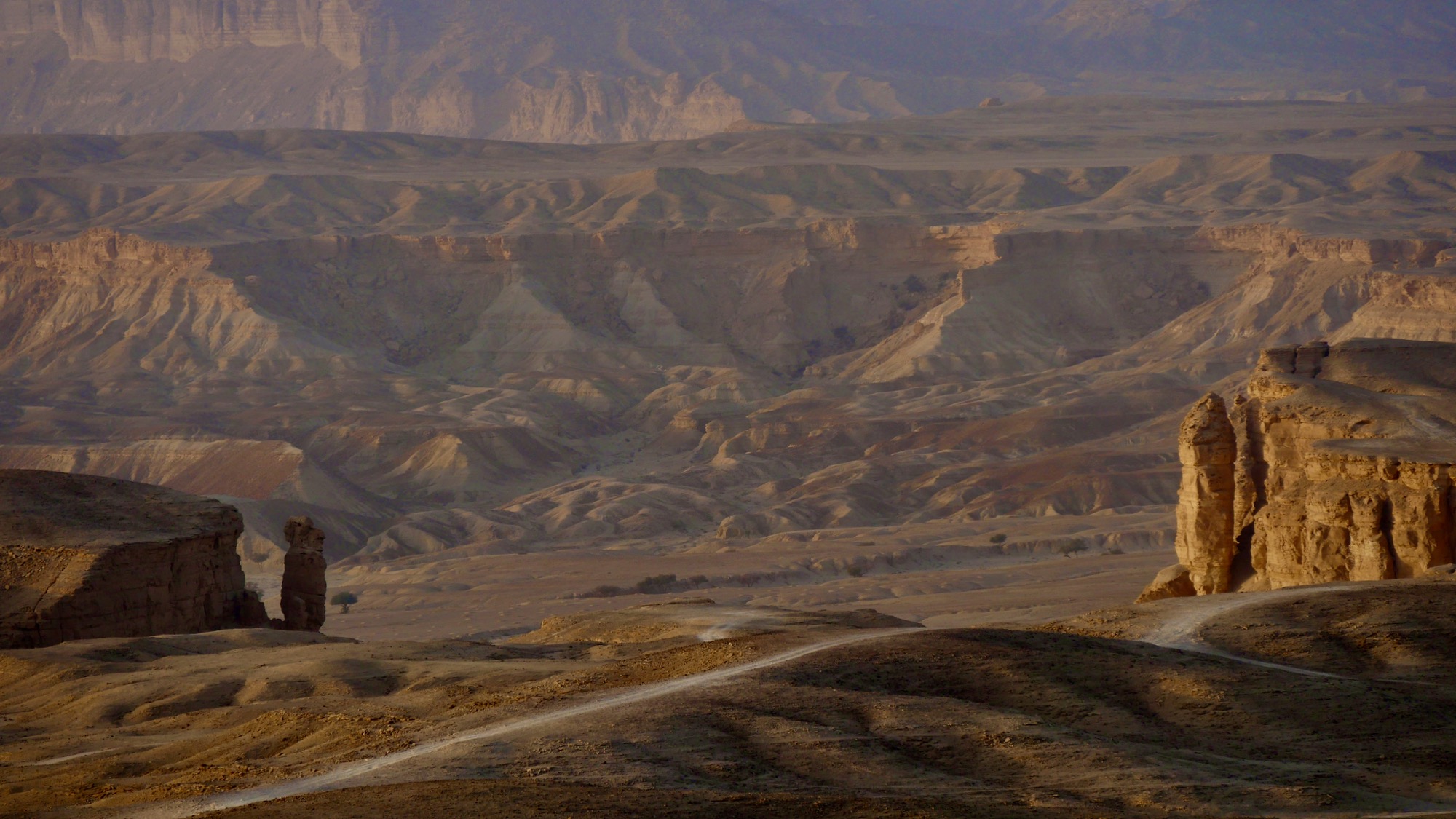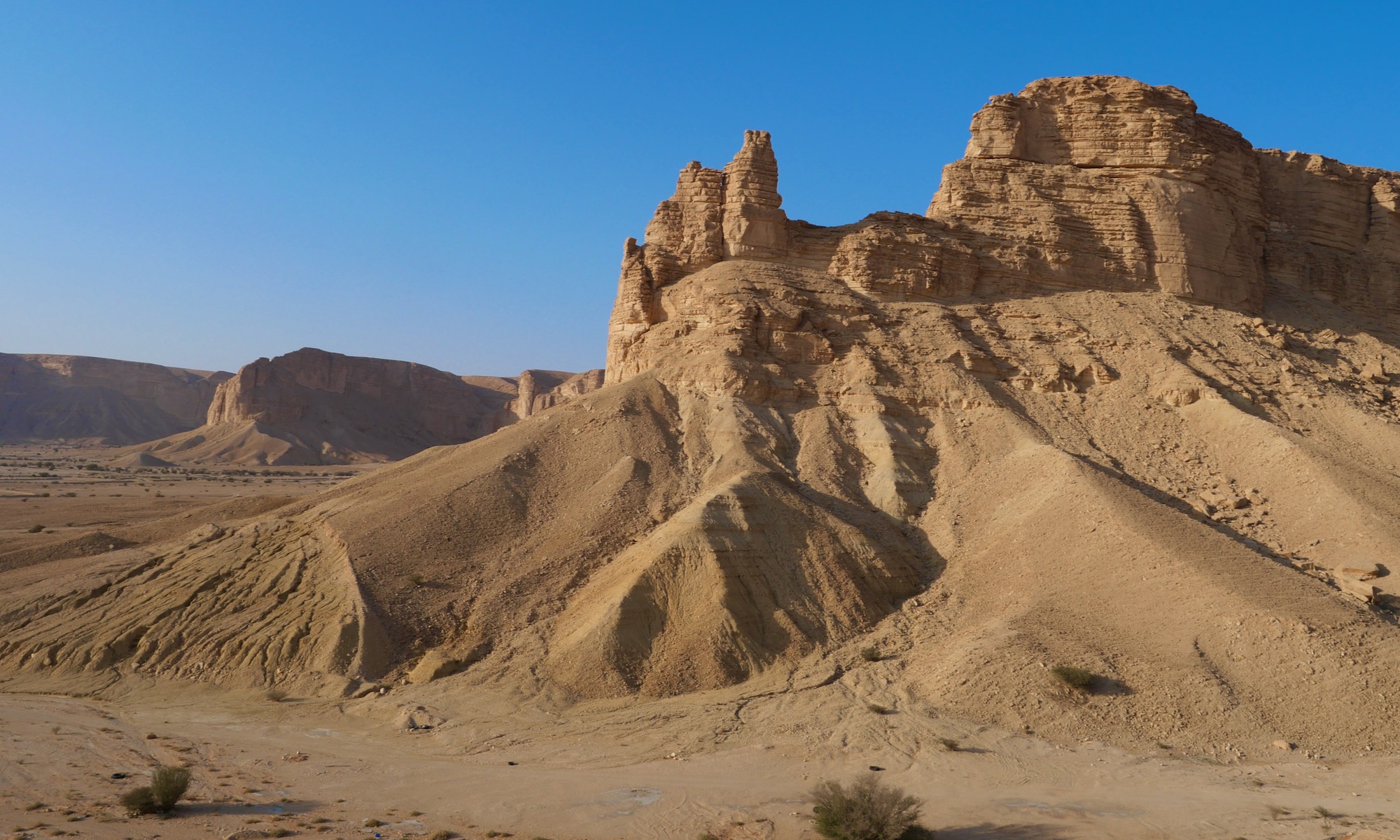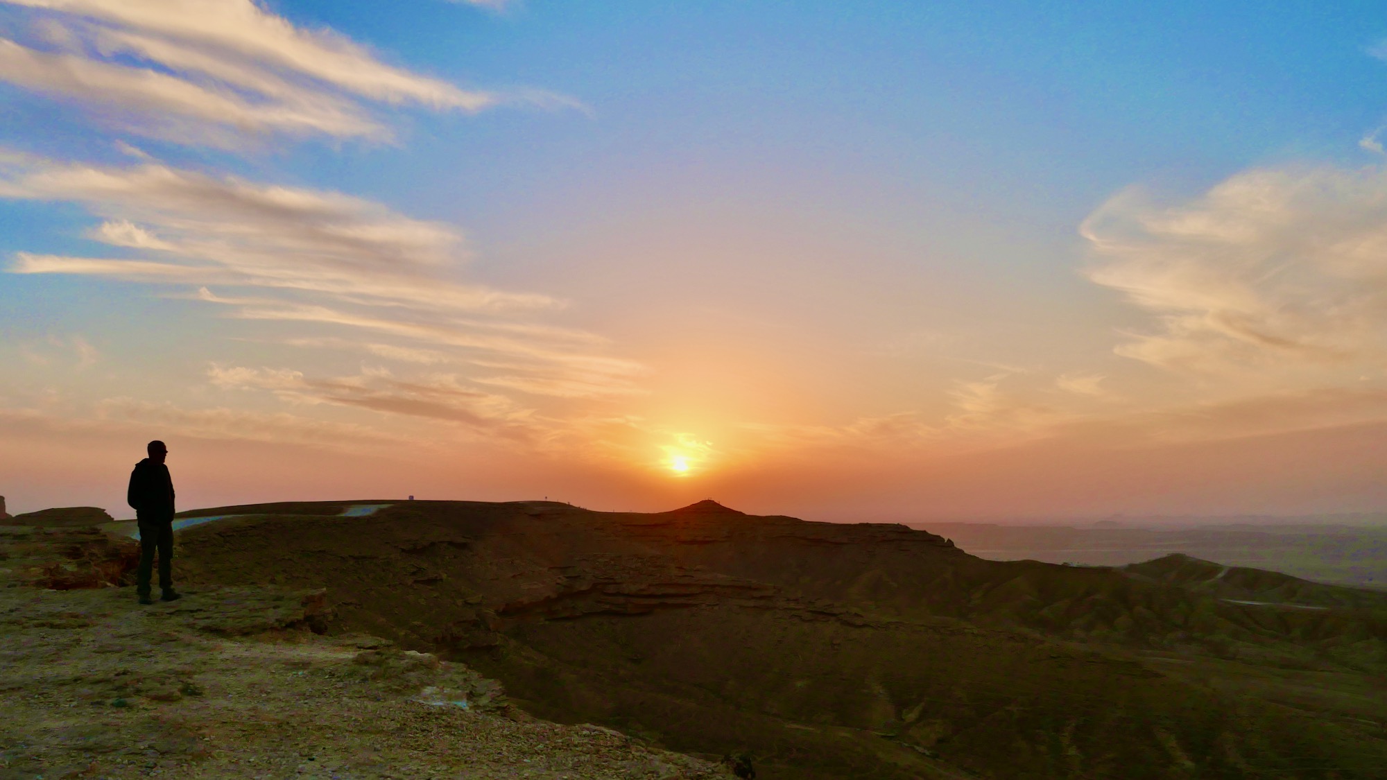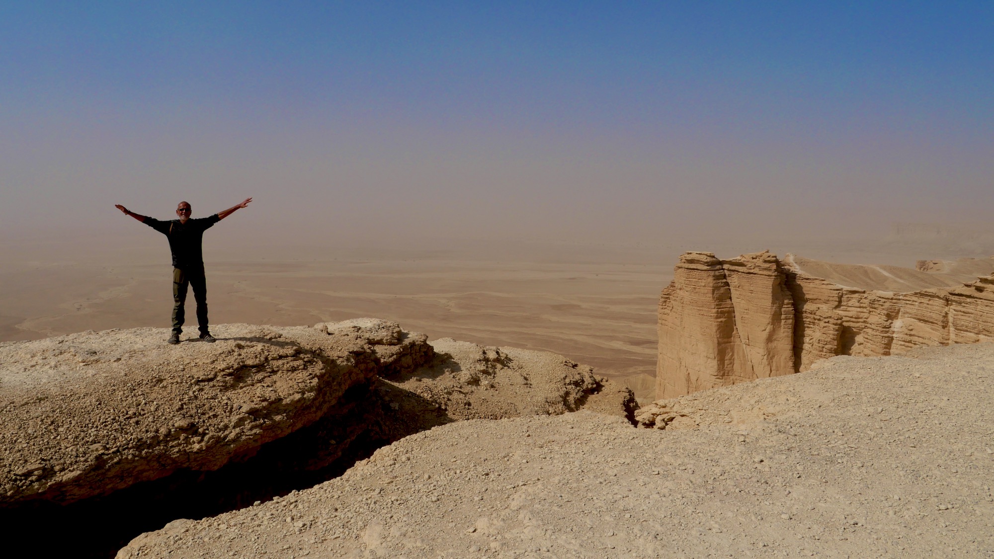 Und tags drauf fahren wir an den Rand der Welt, Edge of the world, auch Jebel Fihrayn genannt, nordwestlich von Riad. Das Felsspektakel ist Teil der wunderschönen Tuwaiq-Berge. Lässt der Name vermuten, dass der blaue Planet doch eine Scheibe ist und der Weg spannend? Nein, tief unten im Tal gehts weiter, und mit Ives Bodenfreiheit ist der Weg überwiegend nur nervig! Dafür belohnt spektakuläre Landschaft mannigfach. Kälte, Wind, der sie scheinbar verstärkt, lässt uns nach zwei Nächten die Berge verlassen.