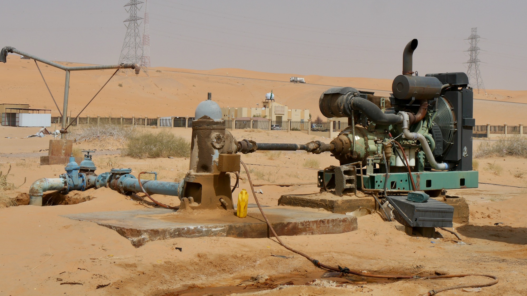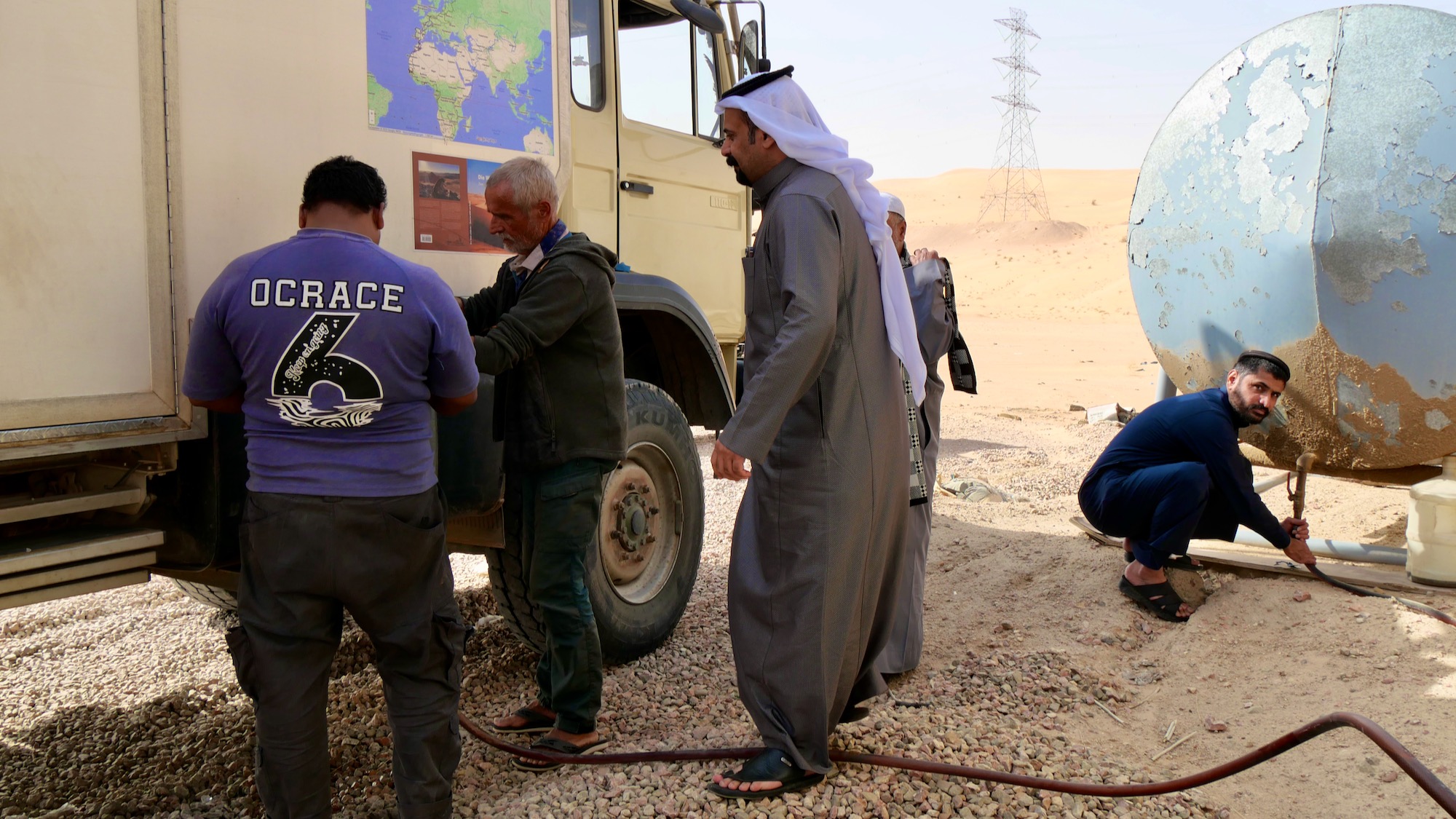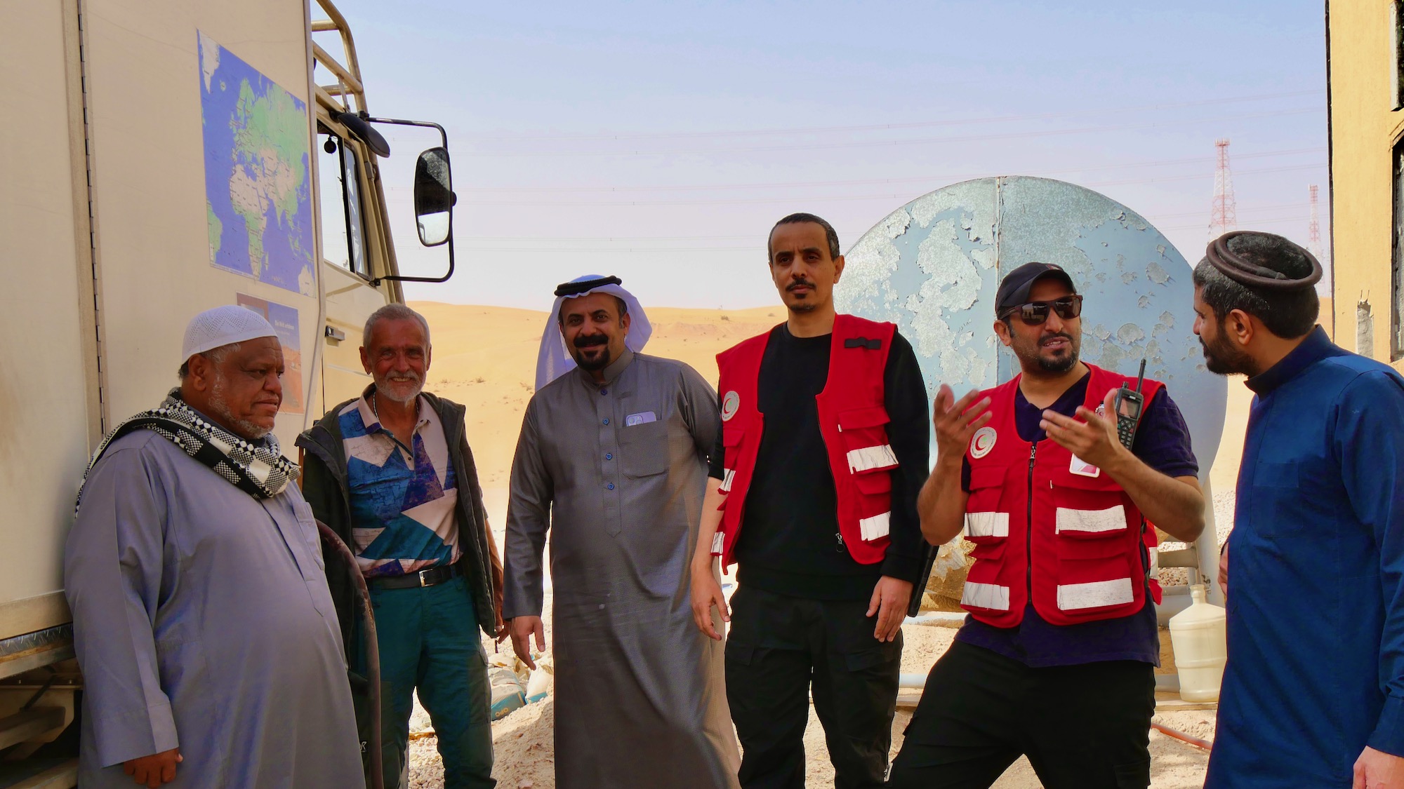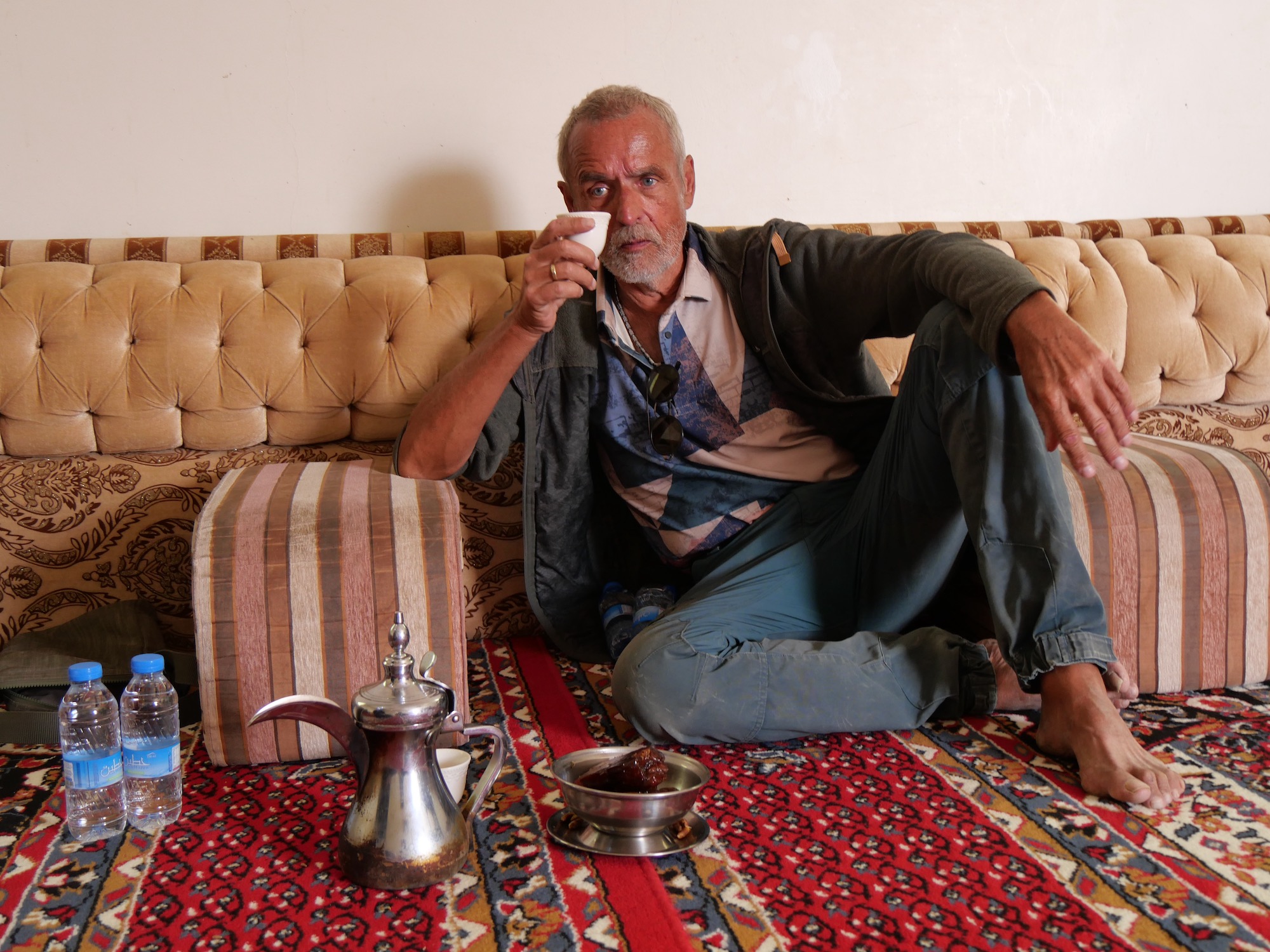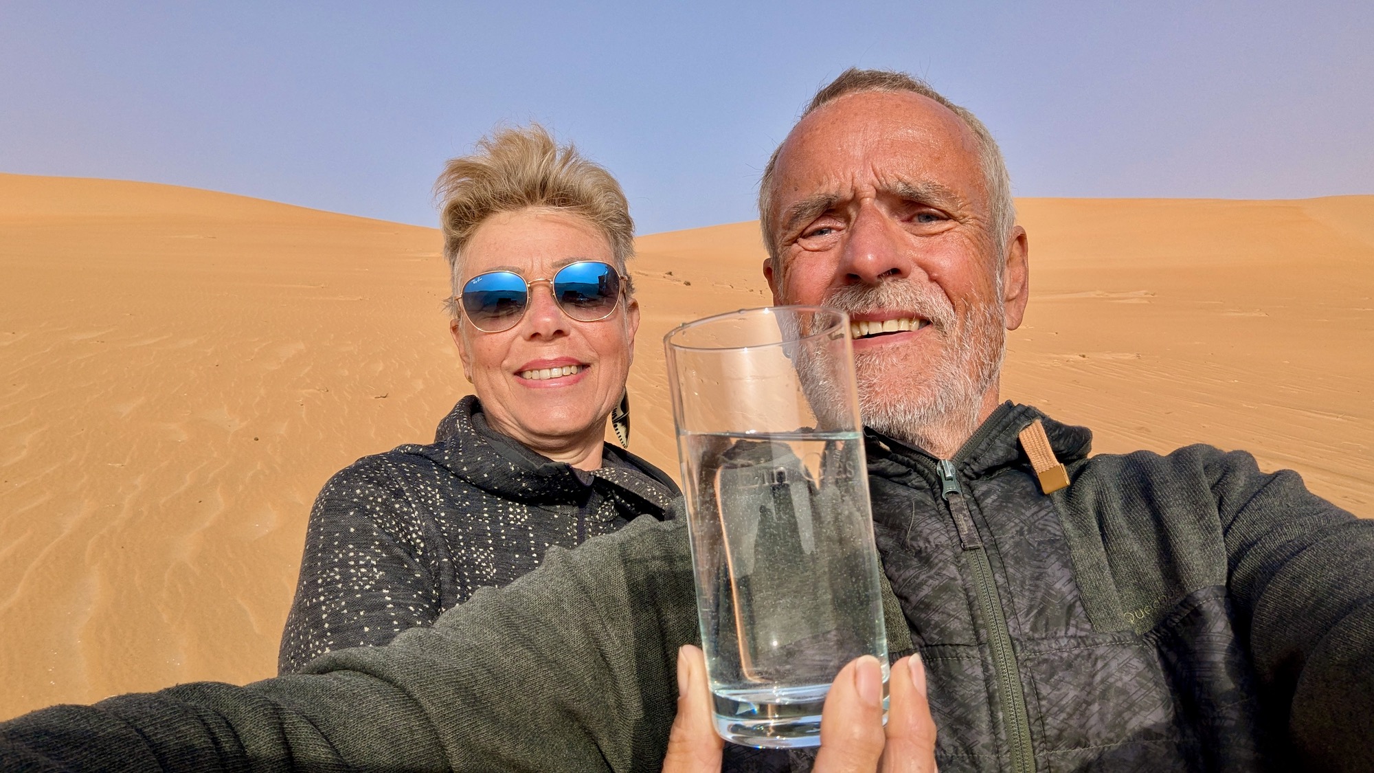 Weiter südlich bei Imnkhli stöbern wir mit Ive einen Weg in die Wüste auf. Sand, in immer wieder neuen Bildern. Weich, fließend, wie flüssiges Gold. Kantig, hart, bizarr. Gleißendes Licht, flirrende Luft, Strukturen verschwinden im Nebel der Helligkeit. Fordernd, aber auch meditativ. Wie die Zentralsahara und die Atacama gehört die Rub al Khali zu den echten Wüsten, nahezu ohne Leben. In der hyperariden Region ist Wasser eine Rarität. Ein Glas Wasser® auf seinem Weg in der Welt (Aktion mit/von der Künstlerin Heike Krüger und Stefan Cotinghui, ich berichtete öfters über die Aktion), Luxus und gleichzeitig Lebensnotwendigkeit. Doch Ives Tanks sind leer. Aufbruch und das Wasser-Glas zieht mit, in der Hoffnung, dass für uns bald wieder mehr als ein Glas Wasser draus wird. Tief im Süden des KSA, dort wo sich der Highway 15 ostwärts in den Jemen, dem Hadramaut, und westlich zum Roten Meer hin wendet, erspäht Jürgen einen Wasserturm, der in Funktion zu sein scheint. Keiner zu hause? Wir wollen schon wieder fahren, da kommt jemand auf uns zu. Klar können wir Wasser haben, lautet die Antwort auf Jürgens Frage. Wie üblich ist der Stutzen zur Füllung der Wassertanker für Ives Anschlüsse zu groß. Aus dem Bassin, das mittels Pumpe mit Grundwasser gespeist wird, bedienen wir uns. Hernach geht Jürgen sich zu verabschieden, fragt nach dem Wasserpreis … Nein, so einfach kommen wir nicht davon. Wir sind an einem Verkehrssicherheitsposten, der Gruppenleiter möchte uns sehen, dies und das erfahren. Das geht nicht ohne Kaffee, wunderbar aromatisiert mit Kardamom, etwas Milch, leicht scharf, dazu süße Datteln und Kommunikation mit Händen und Füßen, ein wenig englisch dazu. Jedenfalls wird klar, dass der Leiter der Station uns nach dem Kaffee in sein Büro bittet, um uns kennenzulernen. Der Bruder des Leitenden wird angerufen, der spricht gut englisch und so kommt ein informatives Gespräch zustande. Die Gruppe erfährt von unseren umfangreichen Reisen, wir erfahren, dass es gleich Lunch für uns gibt, wir unbedingt in die Berge fahren sollen, den Bruder besuchen. Das liegt auf unserem Weg, Telefonnummern werden ausgetauscht. Wenn wir irgendwelche Probleme haben, müssen wir anrufen! Nach dem Essen darf Tee nicht fehlen, der Raum wird mit Myrrhe geräuchert, Gespräche über Weltpolitik geführt. Glatteis in der Wüste, da möchte ich jetzt doch lieber langsam aufbrechen. Nein, nein: wunderbar aromatische Nelken, eine dicke, süße Zimtstange, sterile Wundgazen, zwei Instant-Warm-Kalt-Kompressen sowie etliche kleine Flaschen Wasser werden als Wegpräsente eingepackt. Ach ja, der Stationsleiter weist wiederholt darauf hin, dass der LKW Diesel braucht … Jürgen gibt sich geschlagen, und so wird letztlich auch noch Ive mit 200 l gefüttert. Zum Abschied überreicht mir Mubarak seine rot-weiße Kopfbedeckung, den Shemagh. Überwältigt von der Gastfreundschaft ziehen wir von dannen, verlassen ca. 80 km später den Highway 15 in die Wüste zur Nacht. Das Abendbrot fällt weitgehend aus.