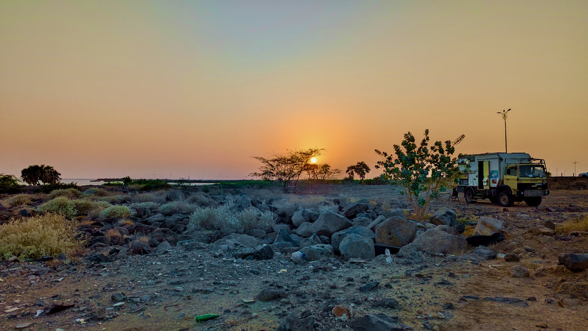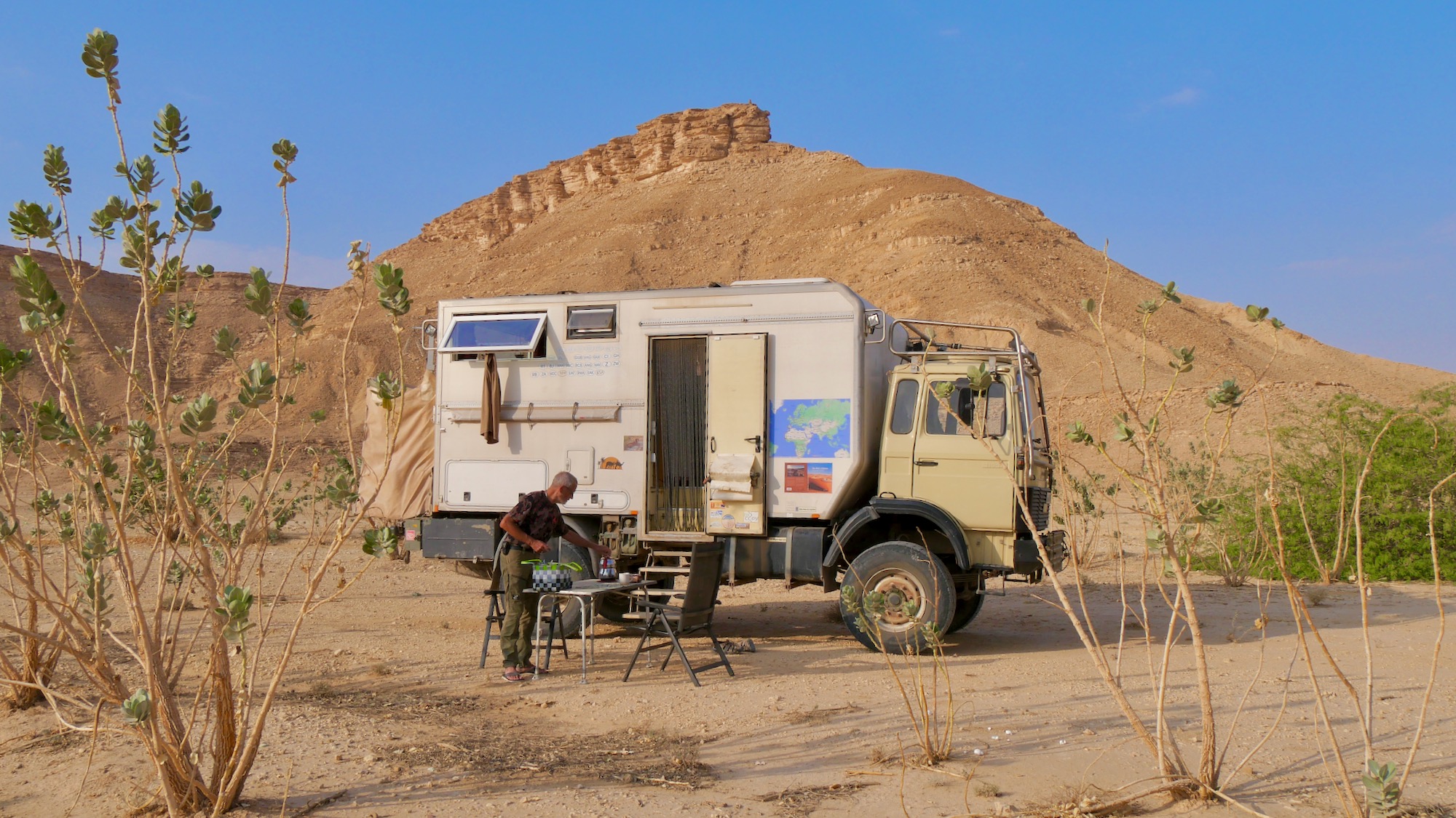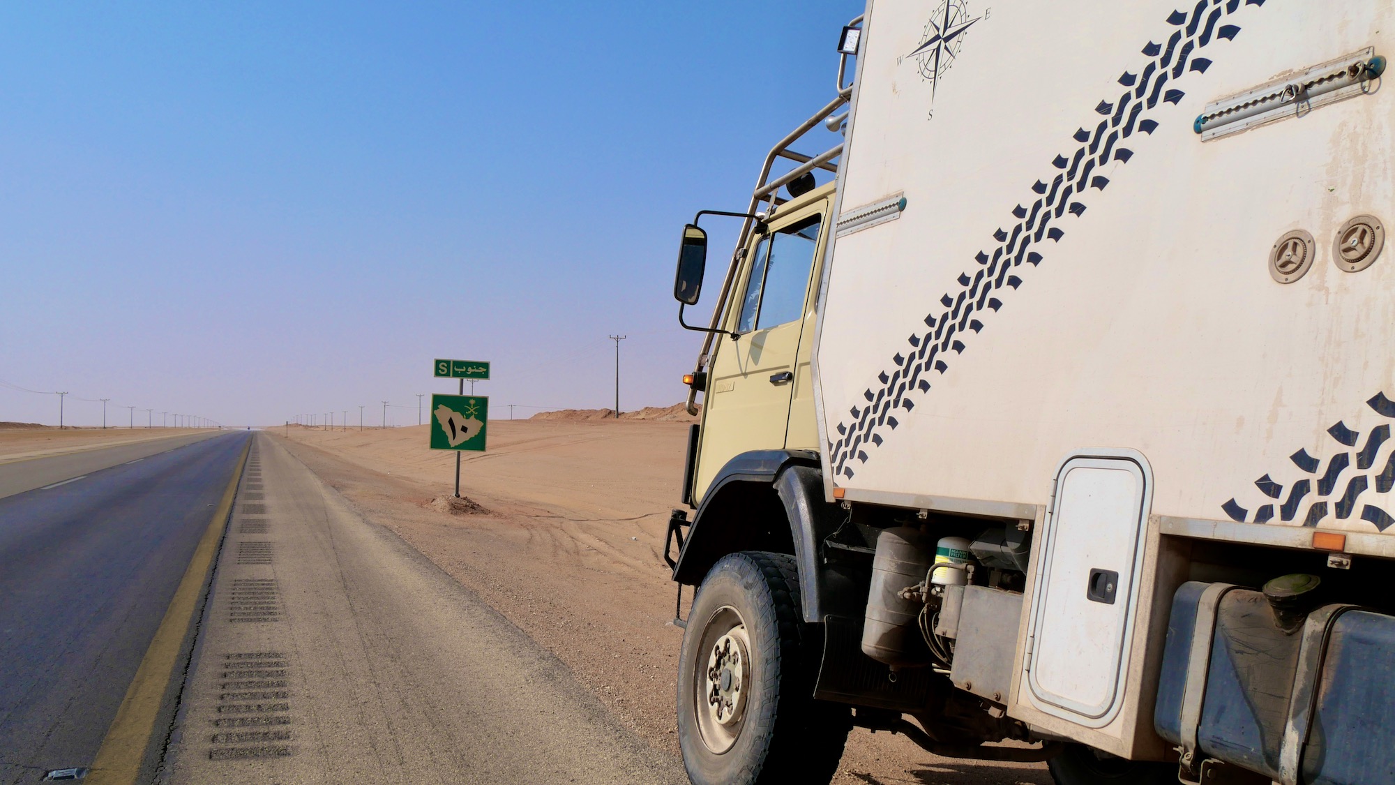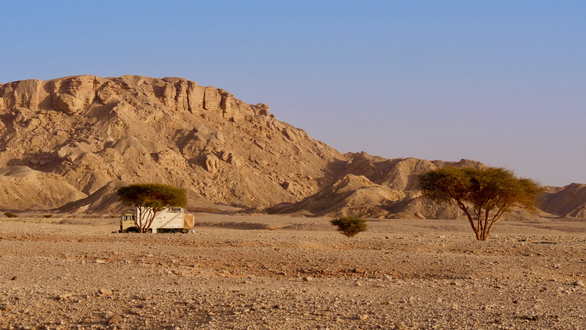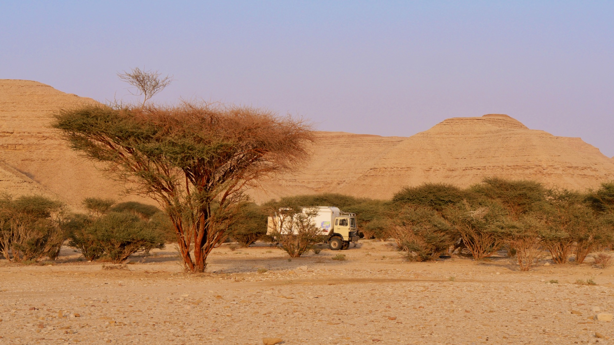 10.01. – 15.01.2026 Viereinhalb Stunden Grenzprocedere für raus und rein. Unkompliziert und schnell, im Minutenbereich, verläuft die Personeneinreise, für den LKW dauert es länger. Kurzer Kabinencheck, dann anstehen an der Röntgenapparatur. Die erhobenen Daten wollen ausgewertet sein, braucht Zeit. Warten. Ok Germany, go! tönt es aus der Anlage, das lassen wir uns nicht zweimal sagen. Schnell erreichen wir den berüchtigten Abschnitt des Highway 10, der den persischen Golf mit dem Roten Meer verbindet. Hinter Al Batha biegen wir müde und hungrig von der Straße ab ins Gelände. Abendbrot im Abendlicht, bevor Kälte uns ins warme Auto treibt. Die Nachttemperaturen sinken bis an den Gefrierpunkt, tagsüber müht sich das Thermometer, die 20° C zu übersteigen.