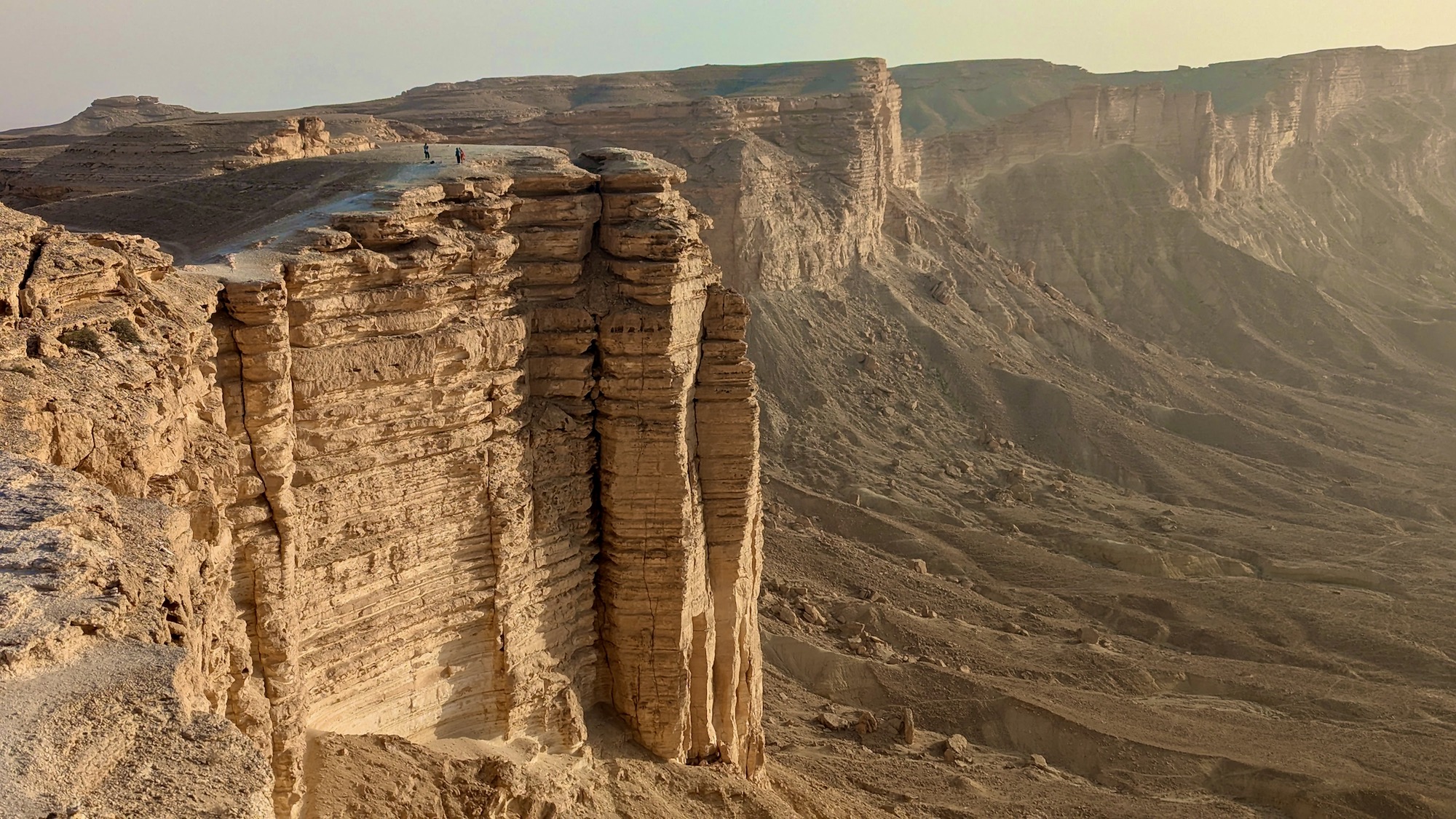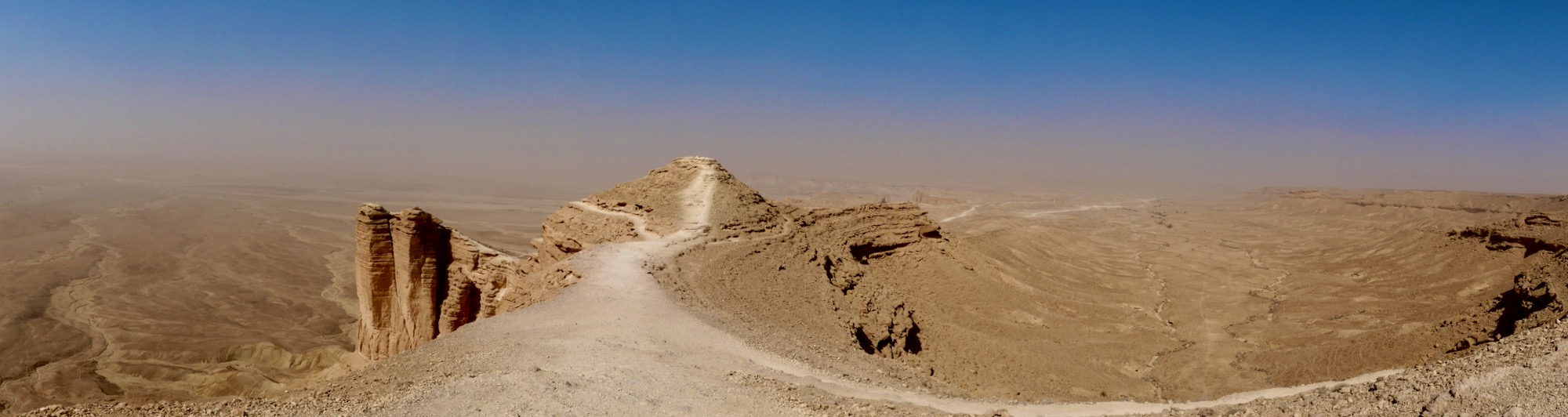 Tipps für Nacherfahrer: Von Sudus (24.99167°N, 46.20750°E) führen eine nördliche und eine südliche Piste zum Rand der Welt, beide wenig ausgeschildert. Die nördliche ist ca. 26 km lang, etwa im letzten Drittel ist an wenigen Stellen Bodenfreiheit nötig, für einen kurzen Streckenabschnitt sollte das KFZ nicht viel breiter als 2,4 m sein. Die südliche Strecke ist mit 20 km kürzer, einfacher und lässt bei guter Sicht schöne Bergwelt mit zahllosen Schluchten erkennen – wir hatten Nebel.