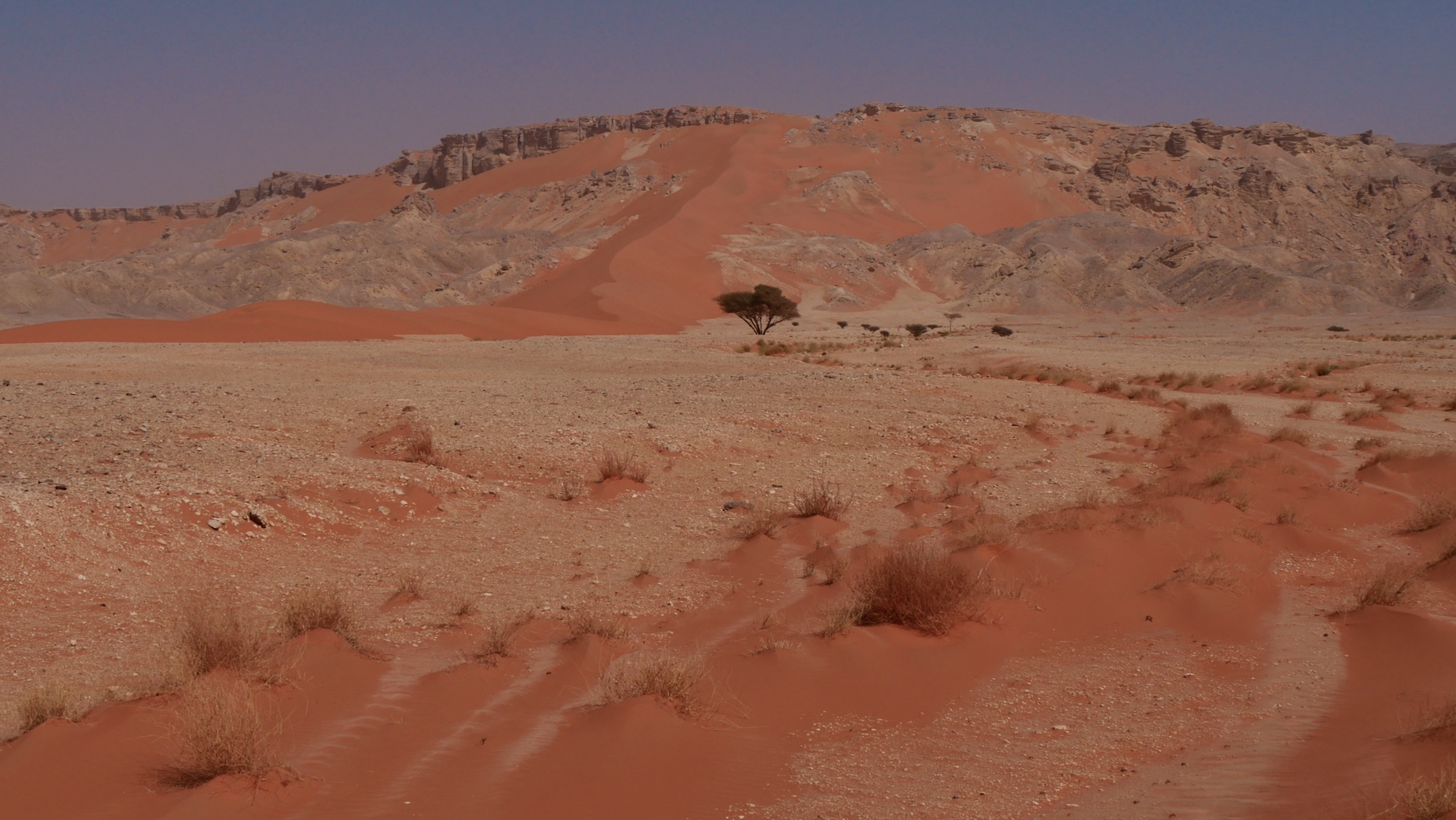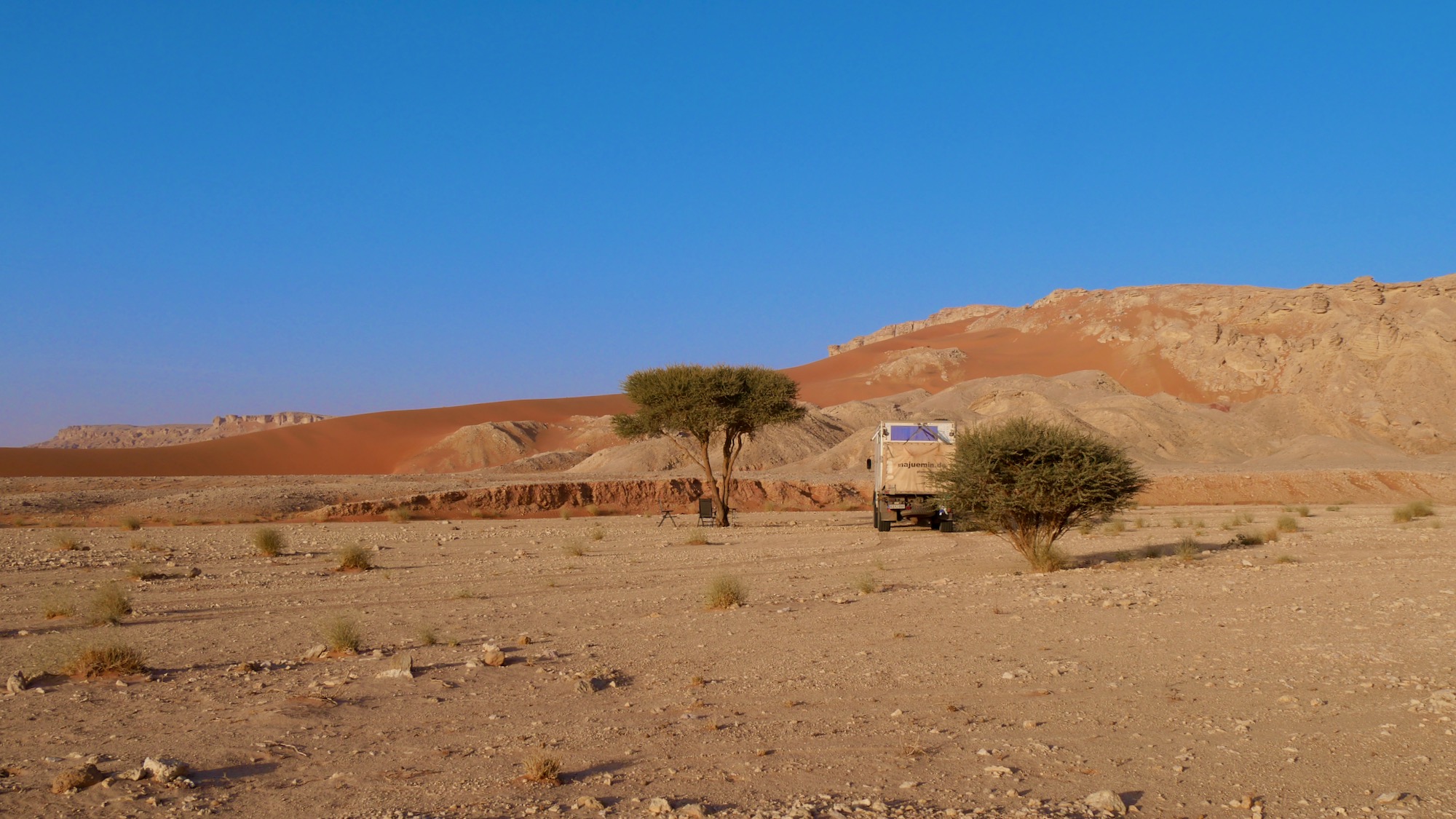 Teepause in wunderschön geschwungener Sicheldünenlandschaft; ich will nicht verschweigen, dass über längere Strecken flaches Ödland zu bewältigen ist. Nach 360 km biegen wir zur Nacht nahe Al Haddar ab, Akazien lockern die Felslandschaft auf.