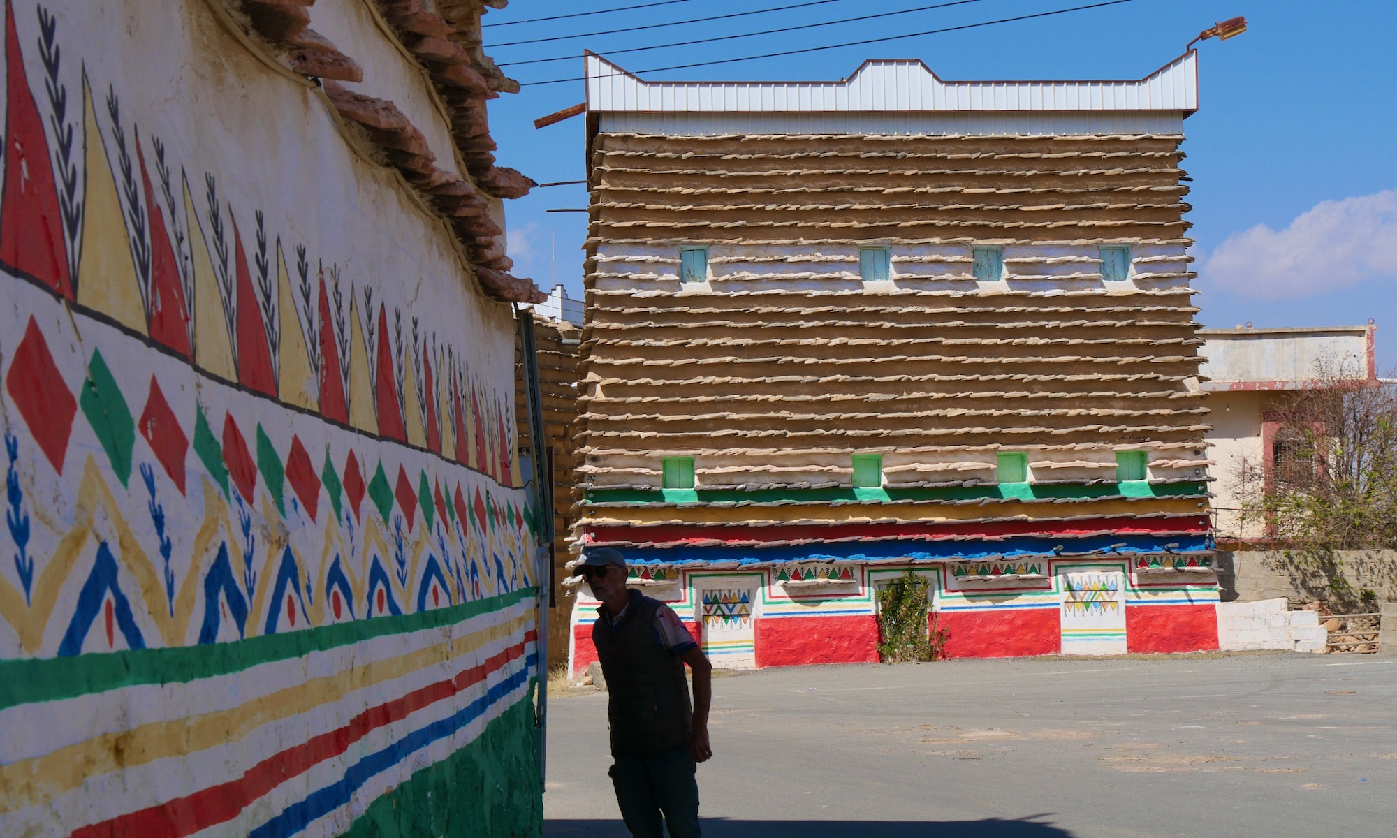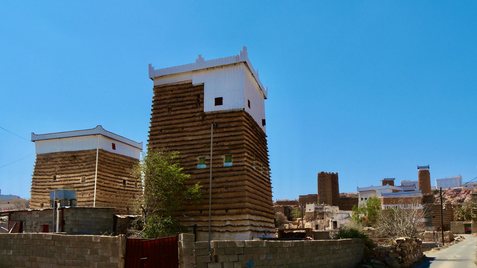 In Al Khalaf, südlich von Sarat Abidah, wird ein schönes Lehmdorf versprochen. Wir sahen bereits einige, entscheiden uns trotzdem für den Besuch. Wie gut! Eine derartige Bauweise haben wir noch nie gesehen, staunen über die Größe der Wachtürme, Häuser, Moscheen, pittoresk ist das Dorf mit seinen kleinen Gassen, schönen Portalen. Das Kleinod wäre der Erhaltung und weiterer Sanierung wert.