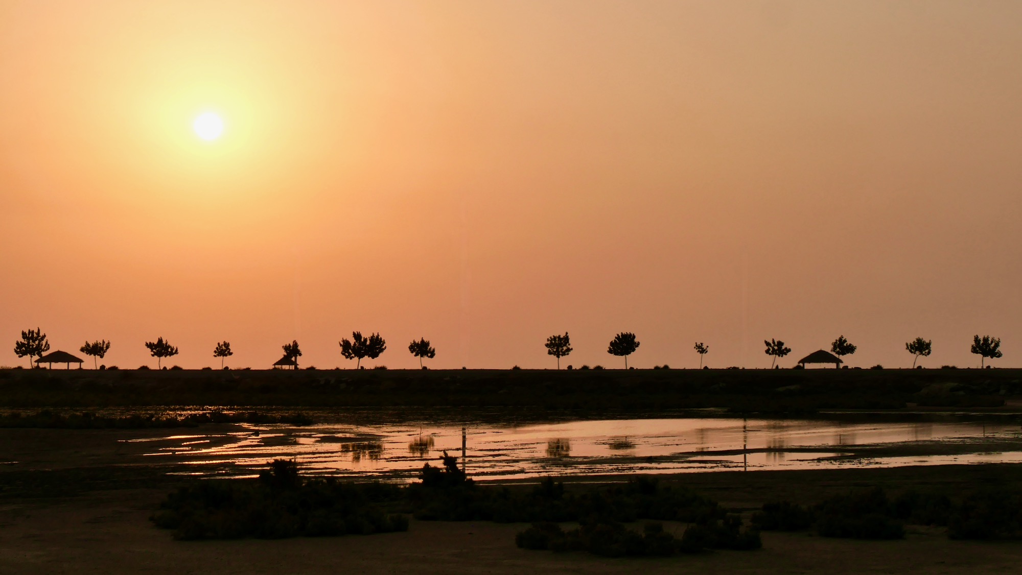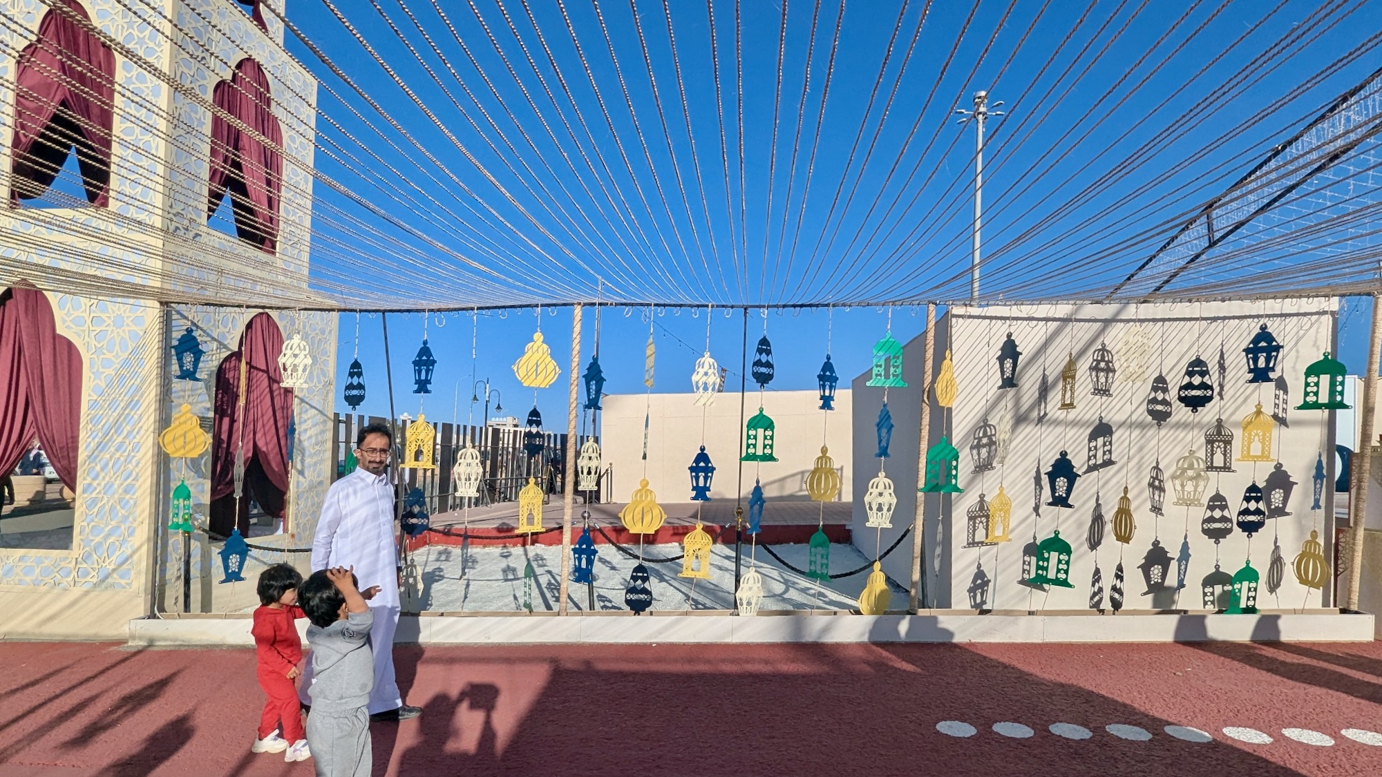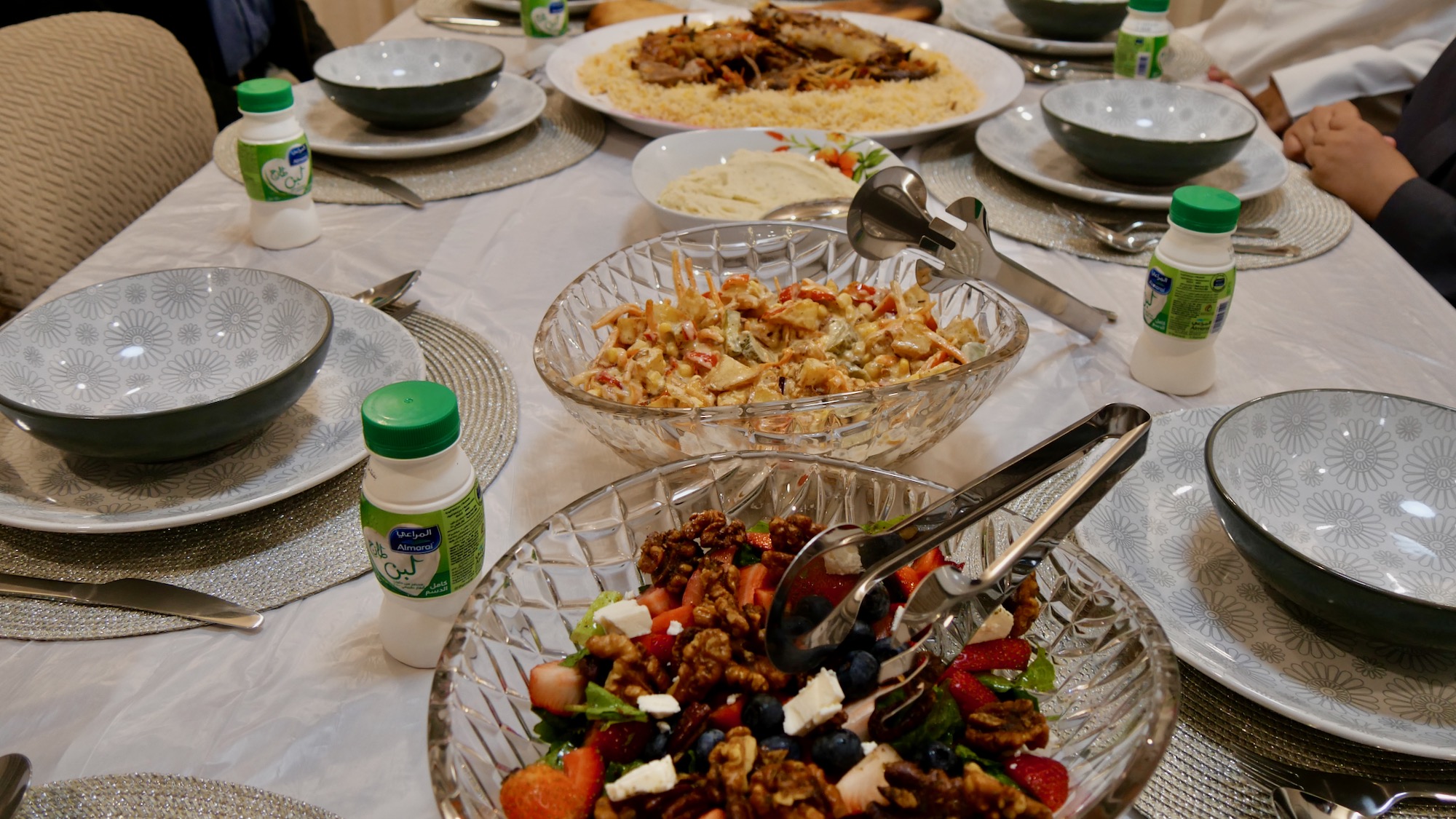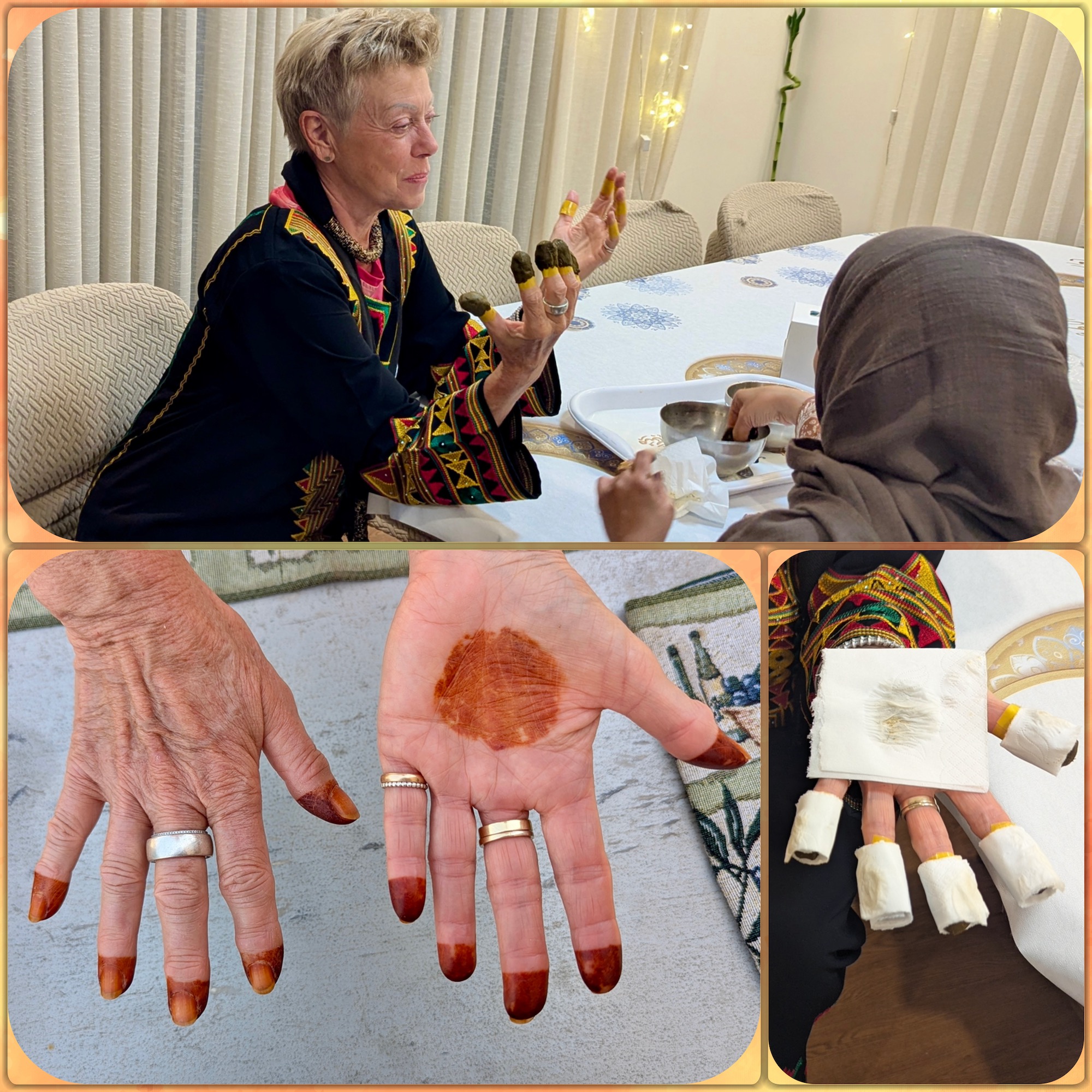Langform: Zwischen Sonnenauf- und –untergang wird gefastet, außer man ist Reisender, Kind, alt, krank, schwanger… Bei Sonnenuntergang endet mit dem Muezzinruf das Fasten. Wasser, gewürzter Kaffee und Süßes bereiten den Körper auf die Mahlzeiten vor. Das anschließende gemeinsame Gebet kann zwischen zehn und sechzig Minuten dauern. Und dann wird gefuttert, dabei sind auch wir zugegen. Wenige Kleinigkeiten erwarb Saleh zuvor auf dem Ramadanmarkt, ähnlich einem Weihnachtsmarkt, nur mit opulentester Essmeile. Eine Street Food Küche reiht sich an die nächste. Da die Sonne während der Öffnungszeiten noch am Himmel steht, wird das köstlich duftende Essen verpackt und nun stellt euch vor, ein gerade gebackener Reibekuchen wird zwei Stunden später verzehrt, schade. Doch am heimischen Herd haben die Damen des Hauses das Meiste frisch zubereitet. Heute Abend tragen sie bunte, leicht figurbetonte Kleider, die von keiner Abaya verdeckt werden, nur die Kopftücher sind dunkel. Wir sind, fast, in der Familie angekommen. Der Essraum ist mit Lichterketten dekoriert, festlich geschmückter Tisch nebst Anrichte biegen sich unter Leckereien. Diverse Gänge werden dargeboten, leider hochkalorisch und nahezu parallel. Als Getränke werden spezielle Ramadansäfte gereicht. Es ist zwischenzeitlich 22:30 Uhr, als im Separee türkischer Mocca, Tee, Datteln und Gebäck auf die Beistelltische kommen. Erzählen, verschiedene kulturelle Bräuche erläutern, vergleichen, Gemeinsamkeiten und Unterschiede entdecken. Die Teenager folgen den Gesprächen mit Mühen, nur die älteste, Remas, bereichert sie insbesondere zur Informationstechnologie, Social Media, KI. Hoch im Kurs stehen auch Erzählungen über Europa, Schneebilder nebst Videos sowie Karnevalfotos. Als ich nach den Hennafingern der Damen frage, ist klar, das soll ich ausprobieren. Unter Lachen und Albern gebe ich meine Hände her. Auf den Kajal um die Augen, der tiefschwarze, rauchige Konturen erzeugt und seit Jahrhunderten insbesondere von Frauen auf der Wasserlinie aufgetragen wird, um die Augen zu betonen und vor Infektionen sowie Sonne zu schützen, verzichte ich. Mir reichen derzeit meine natürlichen dunklen Augenringe. Ein warmherziger Abschied, der älteste Sohn Al Hussin fährt uns zur Farm zurück, um 01:30 Uhr sinken wir ins Bett. Die Familie bleibt wach, wird gegen 03:30 Uhr frühstücken, vor dem neuen Fastentag beten und ca. 05:00 Uhr Ruhe zum Schlaf finden. In Saudi Arabien beginnen Schul- und Arbeitszeit während des Ramadan in der Regel erst um 10:00 Uhr und enden nach sechs Stunden. Alles wiederholt sich, 30 Tage lang!