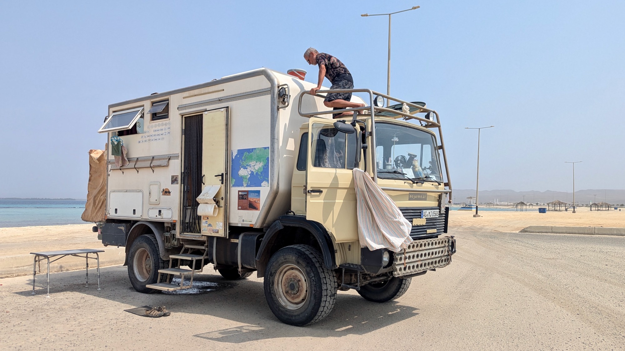 Zum nahen Strand bei Al Birk fährt Jürgen wieder. Wir gönnen uns einen Pausentag. Die zurückliegenden Wochen haben uns trotz wunderbarer Erlebnisse in Deutschland und im KSA sehr gefordert.