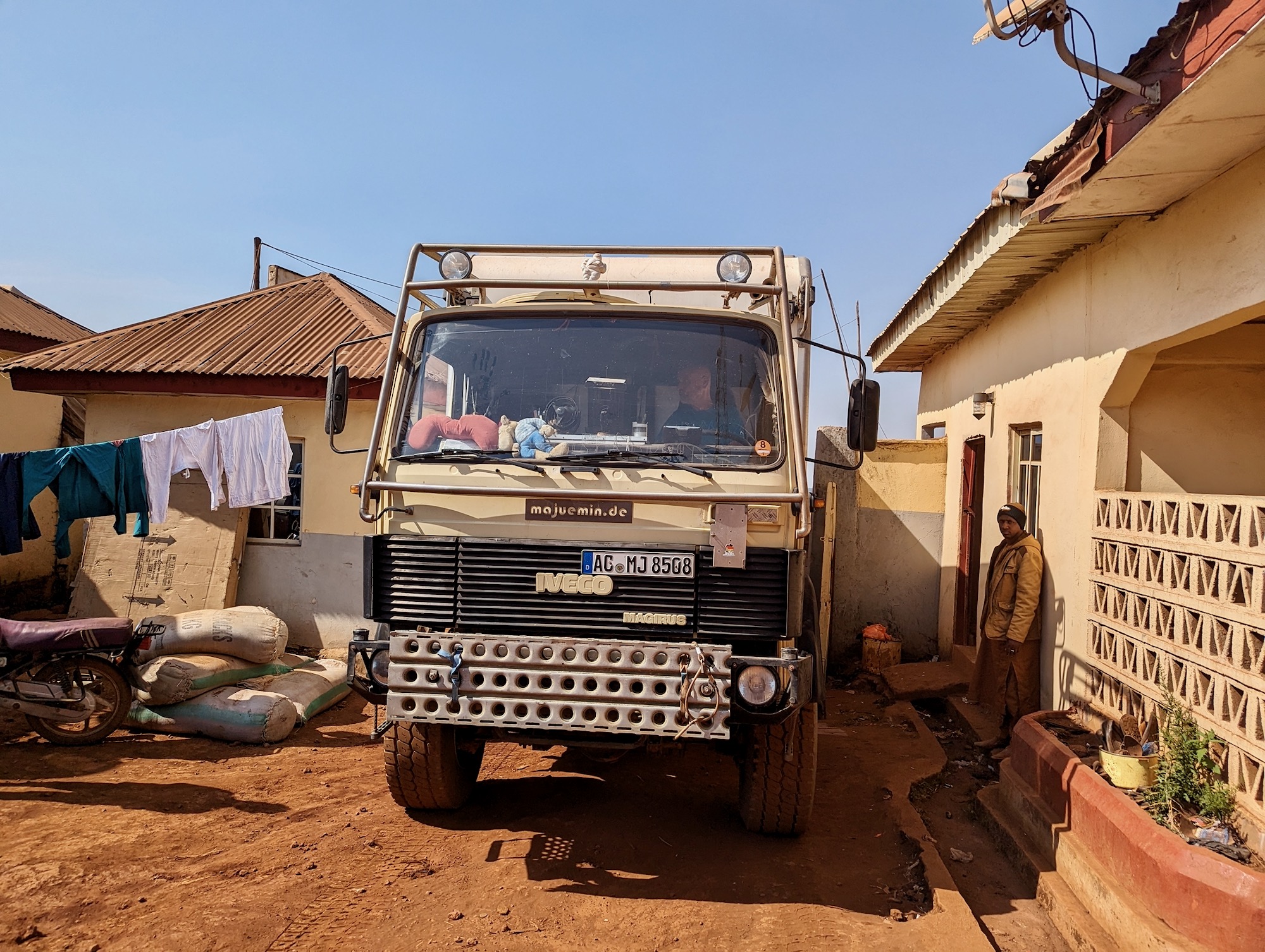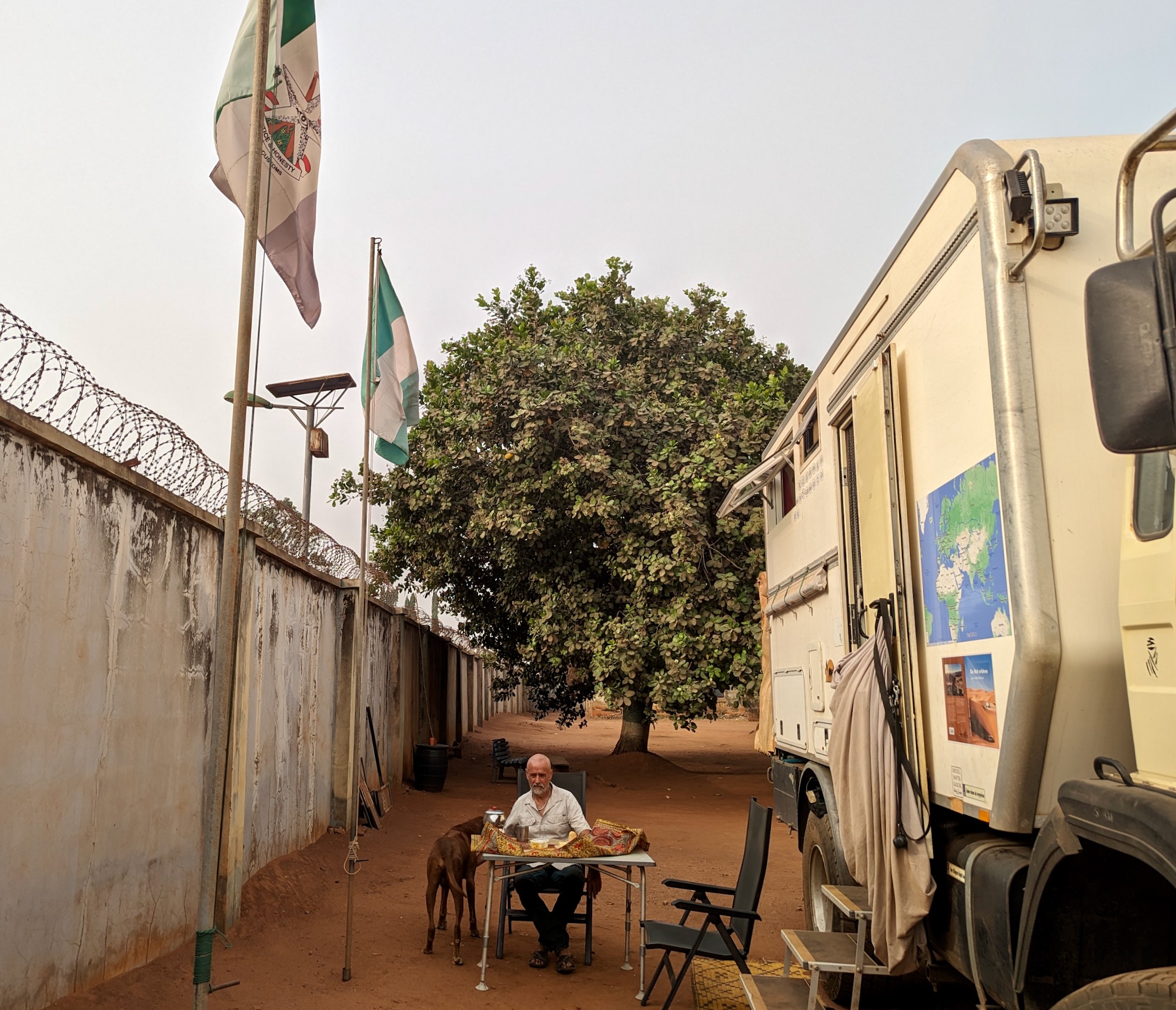 Der Zoll zur Ausreise aus Benin ist in Ketou ca. 20 km vor dem Grenzort Illara. Hier werden die Impfpässe durchforstet, Gelbfieber, Covid … interessierte bei der Einreise niemanden. Vor lauter Gründlichkeit ob unserer Gesundheit vergisst der Stempelmeister, diesen zu schwingen. Jürgen bemerkt dies Gott sei Dank. Nun noch Geld wechseln. 500 EUR tauschen wir in Naira, größter Schein ist ein Tausender, Wert heute ca. ein EUR, morgen weniger. Also, statt Geldbörse Plastiktüte. Der Schlagbaum nach Nigeria öffnet sich. Unser erstes Sorgenland unterwegs nach Süden. Mulmig ist uns zumute. Was hört und liest man nicht alles: aktiveTerrorgruppen, Boko Haram, IS von Norden eindringend, Extremismus, Entführungen, Korruption; Kriminalität. Nährboden bietet die bittere Armut der Menschen in einem ölreichen Land. Inflation, die den Naira, der einst neben dem Dollar Bestand hatte, zu einer Ramschwährung machte. Doch wollen wir auf dem Landweg nach Südafrika, sind Alternativen derzeit rar. Also hindurch durch den offenen Schlagbaum. Wir hören Welcome to Nigeria. Und dann: Die Grenze ist seit Covid geschlossen, doch jemand begleitet uns zum nächsten Grenzübergang in der Nähe. Professionell finden die Stempel die Wege in die Pässe. Nun noch zum Zoll gegenüber. Nein, die Grenze ist geschlossen und man kann das Carnet nicht stempeln (weil man es nicht kennt), ein erforderliches Dokument für die Einreise des LKW kann man nicht ausstellen, die Grenze ist ja geschlossen – außer für Beniner und Nigerianer. Nun empfiehlt uns der Zöllner, der wohl beim Thema Immigration nicht aufgepasst hat, zurück nach Benin zu fahren und bei Lagos den Übergang für die Einreise zu nutzen. Geht´s noch? Wir haben keine Visa für die erneute Einreise nach Benin und wenn wir aus Nigeria rausfahren auch keine zur Rückkehr! Eine andere Lösung muss her. Etliche Diskussionen später und Telefonate mit Obrigkeiten, die Amtsleitern hoch, geleitet uns eine Eskorte zum Hauptzollamt nach Meko. Irgendwann ist hier klar: Wir haben ein Carnet de Passage, brauchen also kein extra Papier, stempeln kann man das CdP auch. Ob der Diskussionen wurde es spät, wir dürfen im Zollhof übernachten. Welcome to Nigeria geht doch!