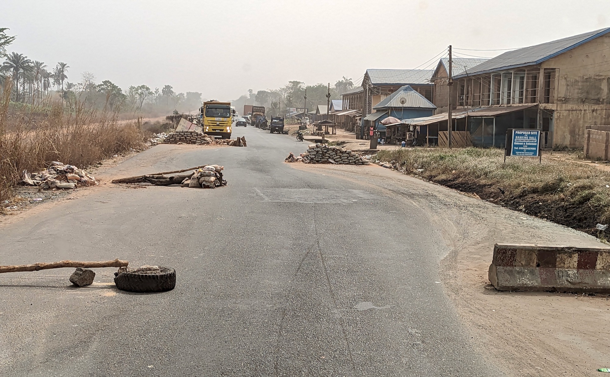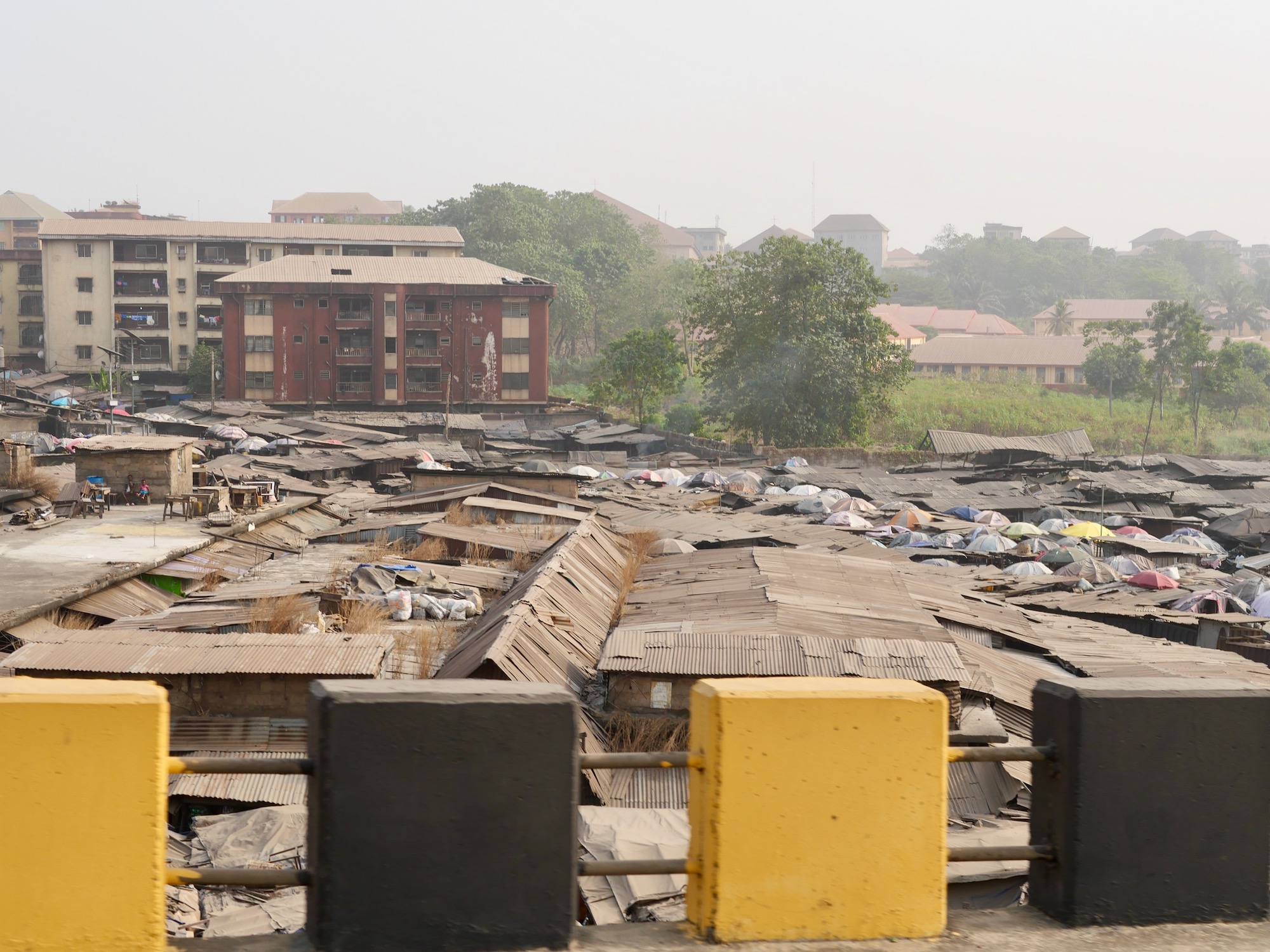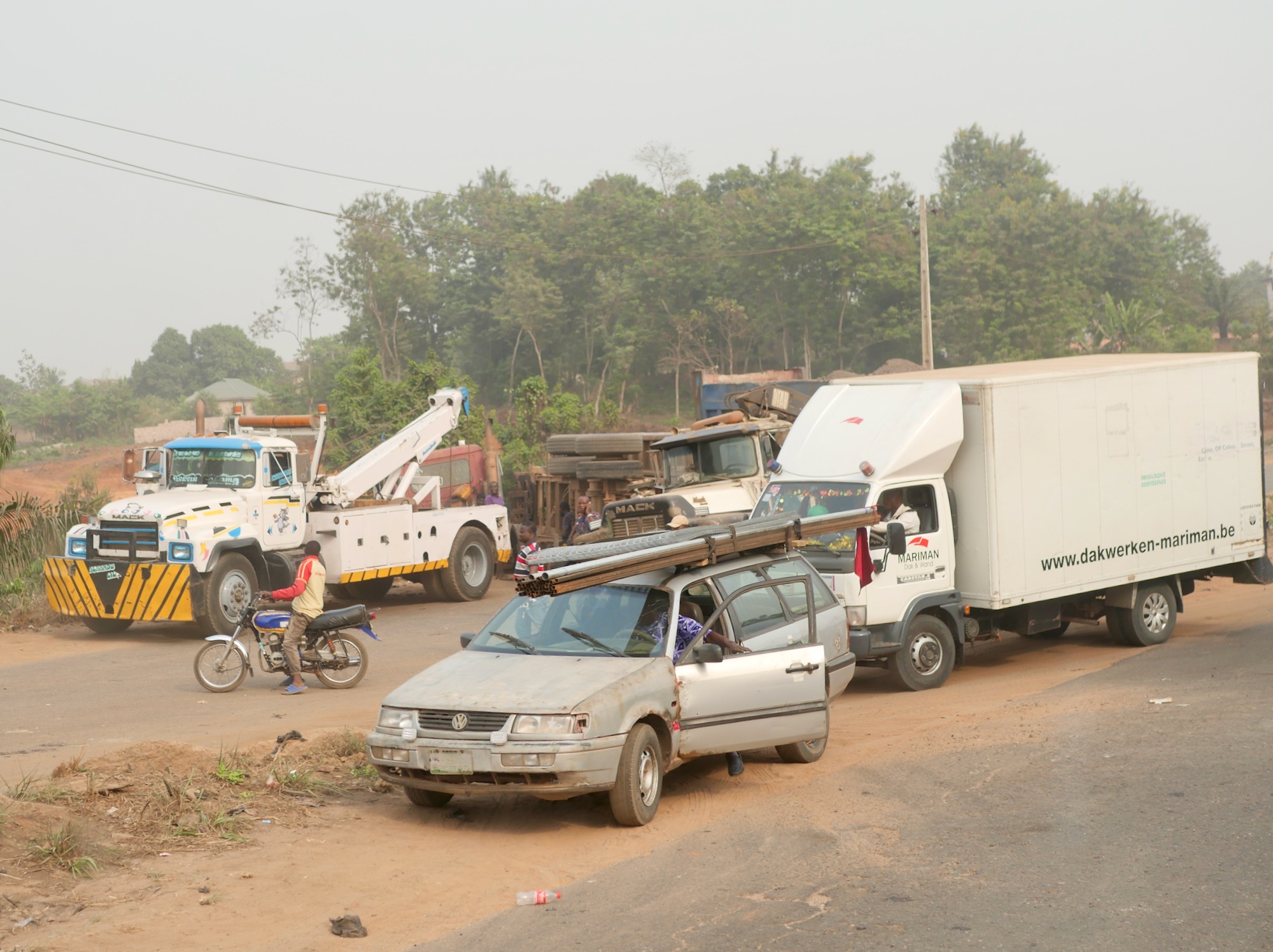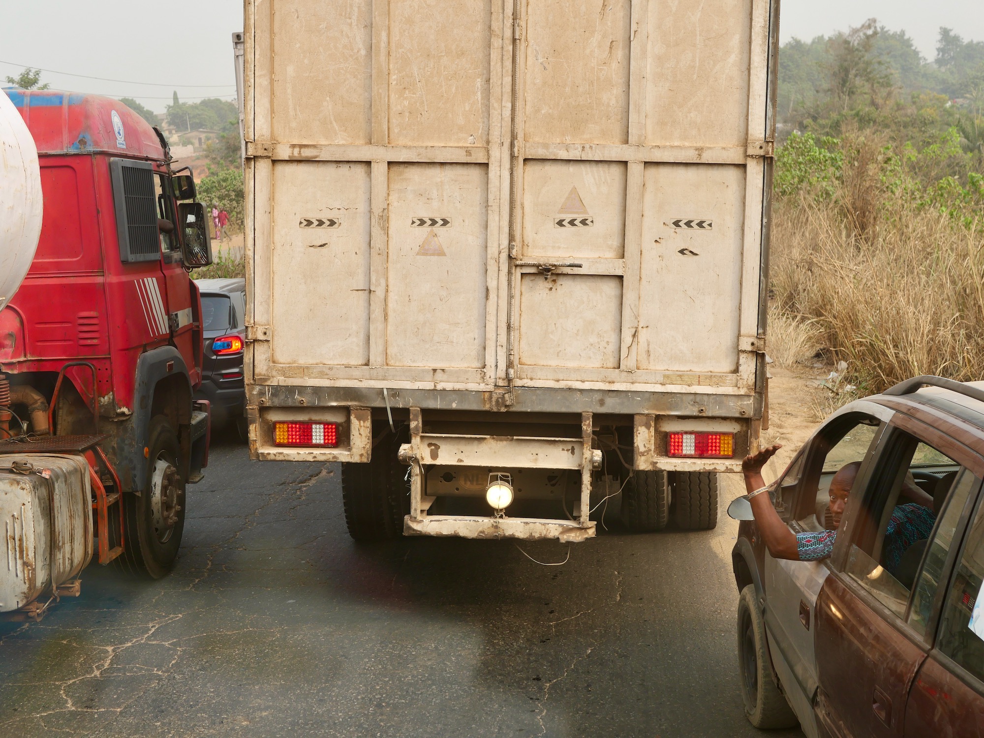 wir wollen den Staat zügig durchfahren, nehmen wir den Trans-Africa-Highway, eine Art Autobahn, allerdings hier und da mit Gegenverkehr vom Fußgänger bis zum LKW. Meist guter Teer. Wenn nicht, können Schlaglöcher oder ausgefranste Fahrbahnränder auch mal einen Kleinwagen verschlucken. Es herrscht Rechtsverkehr, auch beim überholen insbesondere langsamer LKW, denn die wollen bzw. können sich nicht auch noch mit den Schikanen am rechten Fahrbahnrand auseinandersetzen und bleiben gleich links. Tankstellen gibt es bei einem der größten Rohölexporteure wie Sand am Meer, Diesel eher weniger. Auch die bislang gewohnt üppige Versorgungslage insbesondere mit frischem Brot, Obst und Gemüse ist mäßig. Wer will schon vergastes Zeugs oder pappigen, gesüßten Toast? Heiß und zum schneiden dick ist die Luft, ruß- und ölgeschwängert, gemischt mit Rauch. Ein Truckerparkplatz bei einem Policecheckpoint in Oko-Eko eignet sich zur Nacht. Apropos Polizeikontrollstation. Wer, was auch immer kontrolliert, können wir nicht jedesmal ausmachen, es heißt jedoch meist schlechte, zerstörte Straße, Holzstämme, alte Reifen oder Fässer zur Slalomfahrt zwingend, mehr oder weniger martialisch. Meist Uniformierte, trotz der Hitze mit schwarzen Sturmhauben, oft mit ganzen oder halben Totenköpfen versehen, mit Kalaschnikow, G3, Powergun oder dicken, langen Holzknüppeln. Strategie: Ich halte beim ranfahren den Kopf aus dem Fenster, mal rechts mal links, grinse den mit dem Anhalterjob an und rufe Hello Sir, good morning Sir,  – also je nach Tageszeit – how are you? Dann schaut dieser erstaunt, grinst zurück und ruft Hello Madame, oder Mama, Mammy, welcome, salutiert hier und da. Hält er uns tatsächlich an, dann um zu erfahren, was white people in Nigeria machen … Kontrolliert hat den LKW und sein Innenleben außer bei Ein- und Ausreise in Marokko bislang niemand. Neugierige blickten ab und an hinein. Trotzdem sind die mannigfachen Kontrollstellen, in manchen Gegenden nur hunderte Meter voneinander entfernt, zeitraubend, nervenaufreibend, wir wissen ja auch nie, wie es denn tatsächlich abläuft. Nicht zuletzt sind martialisch aussehende, bewaffnete Männer kein Zeichen dafür, dass im Staat alles in Ordnung ist.