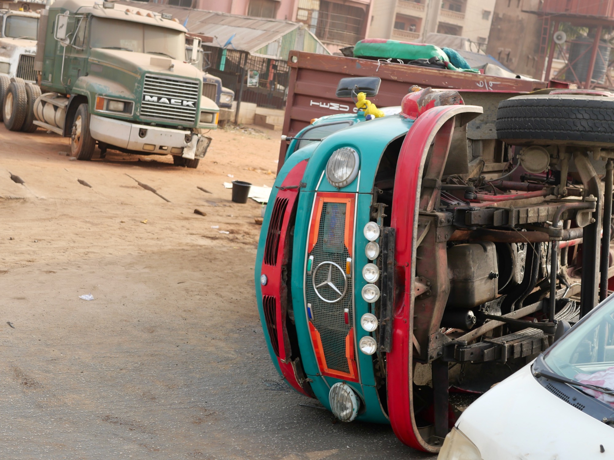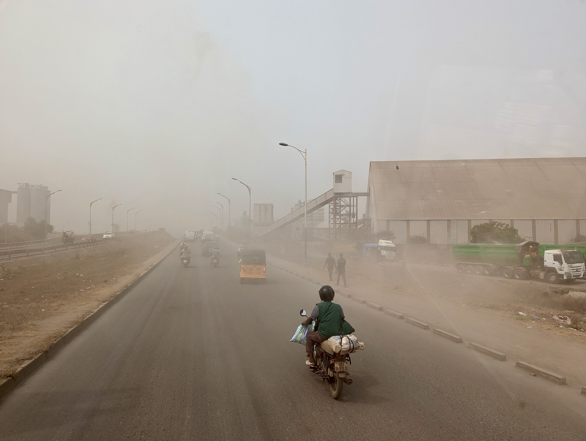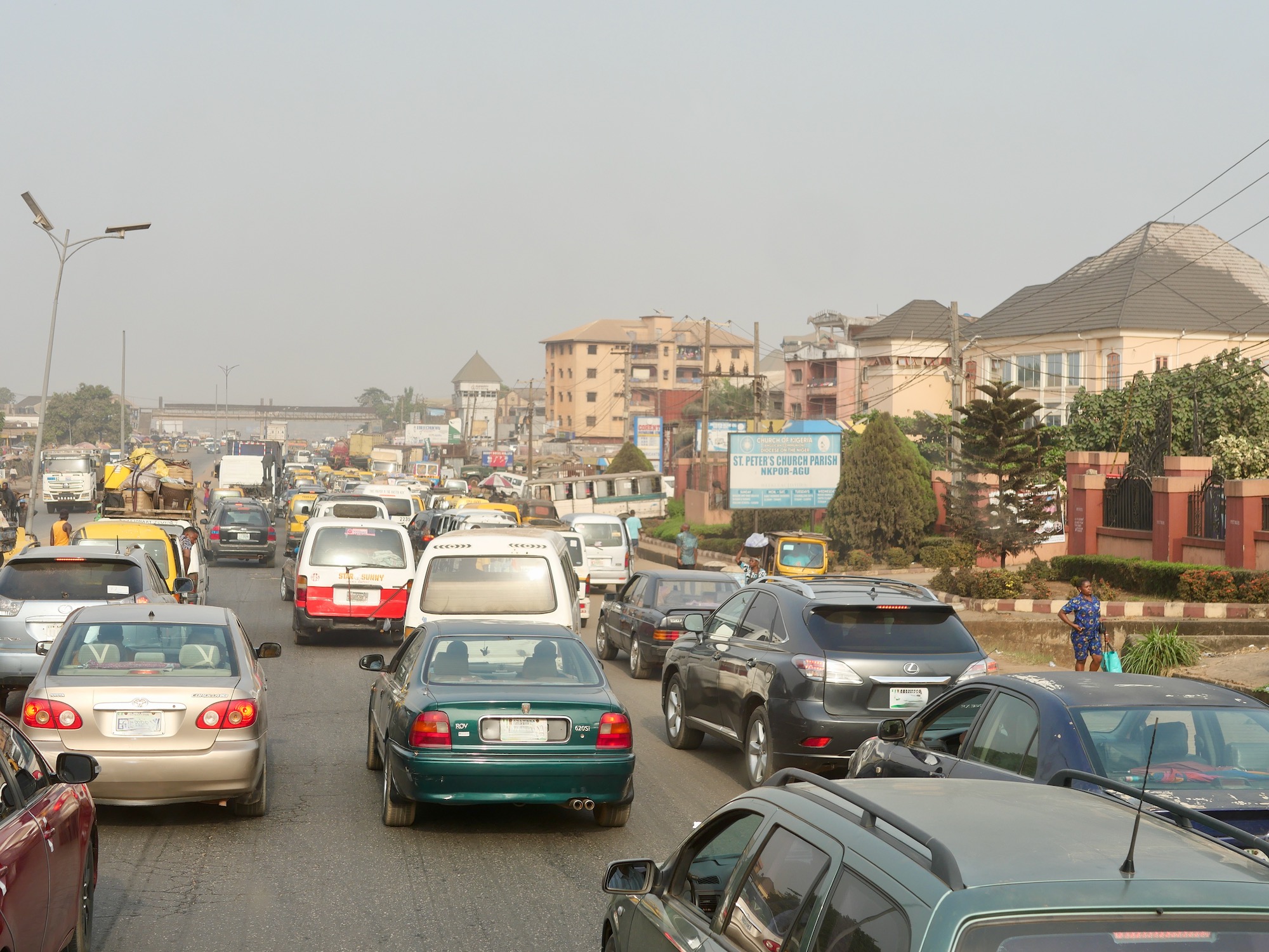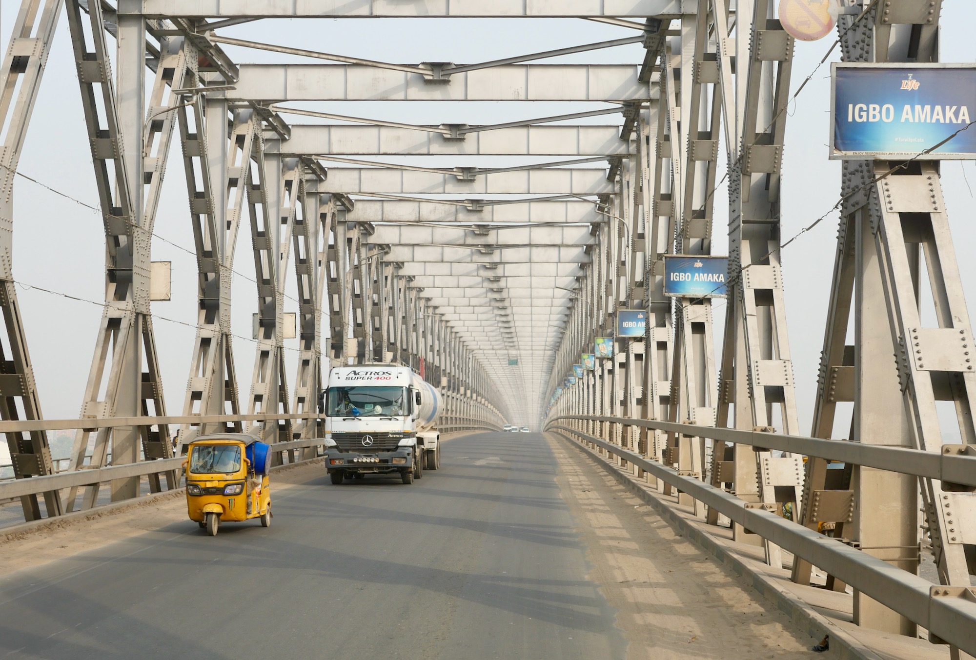 wir wollen den Staat zügig durchfahren, nehmen wir den Trans-Africa-Highway, eine Art Autobahn, allerdings hier und da mit Gegenverkehr vom Fußgänger bis zum LKW. Meist guter Teer. Wenn nicht, können Schlaglöcher oder ausgefranste Fahrbahnränder auch mal einen Kleinwagen verschlucken. Es herrscht Rechtsverkehr, auch beim überholen insbesondere langsamer LKW, denn die wollen bzw. können sich nicht auch noch mit den Schikanen am rechten Fahrbahnrand auseinandersetzen und bleiben gleich links. Tankstellen gibt es bei einem der größten Rohölexporteure wie Sand am Meer, Diesel eher weniger. Auch die bislang gewohnt üppige Versorgungslage insbesondere mit frischem Brot, Obst und Gemüse ist mäßig. Wer will schon vergastes Zeugs oder pappigen, gesüßten Toast? Heiß und zum schneiden dick ist die Luft, ruß- und ölgeschwängert, gemischt mit Rauch. Ein Truckerparkplatz bei einem Policecheckpoint in Oko-Eko eignet sich zur Nacht. Apropos Polizeikontrollstation. Wer, was auch immer kontrolliert, können wir nicht jedesmal ausmachen, es heißt jedoch meist schlechte, zerstörte Straße, Holzstämme, alte Reifen oder Fässer zur Slalomfahrt zwingend, mehr oder weniger martialisch. Meist Uniformierte, trotz der Hitze mit schwarzen Sturmhauben, oft mit ganzen oder halben Totenköpfen versehen, mit Kalaschnikow, G3, Powergun oder dicken, langen Holzknüppeln. Strategie: Ich halte beim ranfahren den Kopf aus dem Fenster, mal rechts mal links, grinse den mit dem Anhalterjob an und rufe Hello Sir, good morning Sir,  – also je nach Tageszeit – how are you? Dann schaut dieser erstaunt, grinst zurück und ruft Hello Madame, oder Mama, Mammy, welcome, salutiert hier und da. Hält er uns tatsächlich an, dann um zu erfahren, was white people in Nigeria machen … Kontrolliert hat den LKW und sein Innenleben außer bei Ein- und Ausreise in Marokko bislang niemand. Neugierige blickten ab und an hinein. Trotzdem sind die mannigfachen Kontrollstellen, in manchen Gegenden nur hunderte Meter voneinander entfernt, zeitraubend, nervenaufreibend, wir wissen ja auch nie, wie es denn tatsächlich abläuft. Nicht zuletzt sind martialisch aussehende, bewaffnete Männer kein Zeichen dafür, dass im Staat alles in Ordnung ist.