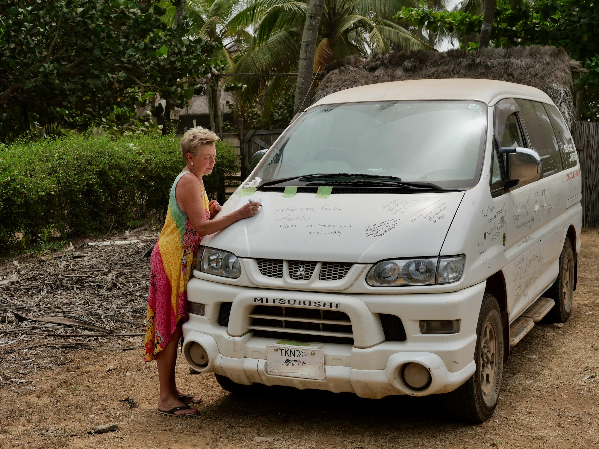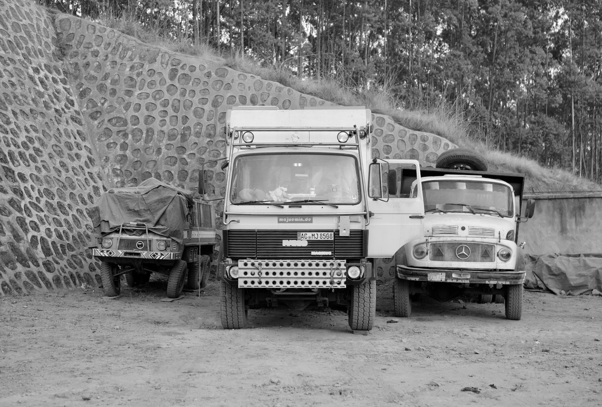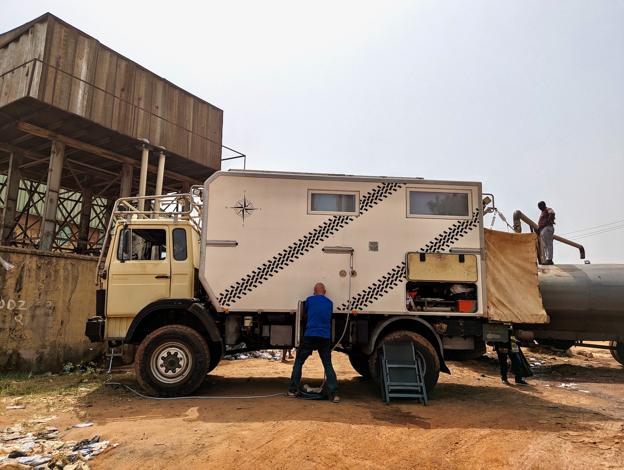 Takum, in Mararaba, geschieht das, was wir uns in unseren Alpträumen ausmalten. Mitten auf der Straße, ausgebremst durch einen Polizeiposten, versagt Ive den Dienst. Angekündigt hat sich unwilliges Startverhalten erstmals in Senegal. Doch in letzter Zeit hilft Jürgens Lösungsansatz, den Einspritzkreislauf ab und an von Hand zu entlüften, nur noch schlecht. Und jetzt ist dort, wo man nicht als Ziel, sondern ständig in Bewegung sein will, Schluss. Der Druck, der auf uns lastet, ist enorm. Kein Internet für Kontakte mit daheim, wir können nichts recherchieren, uns nicht mit Experten ob Ideen austauschen. Jürgen stellt seine Diagnose und weiß, dass wir ohne Hilfe und Ersatzteile nicht weiterkommen. Ich frage nach einer Werkstatt. Tatsächlich soll es die in unmittelbarer Nähe geben. Ein großer Dreckplatz, umringt von Holzschuppen, schlafenden Männern, betenden Muslimen … Oh mein Gott! Doch unser Guide meint no worry mama, als er meine Verzweiflung sieht. Und kurz drauf kommt am Sonntagnachmittag Oman. Jürgen erklärt das Problem, Oman zieht das Ersatzteil aus der Hosentasche, welches Jürgen bei Ive als fehlerhaft identifizierte. Gemeinsam wird in der Gluthitze, mehr als 40º C, an Ive geschraubt. Oman stellt noch eine defekte Pumpe fest. Die besorgt er mal eben, schraubt weiter und nach drei Stunden startet Ive wieder – nicht wie gewohnt spritzig, doch (hoffentlich) zuverlässig. Zehntausend Naira sollen wir zahlen, incl. der Ersatzteile von Bosch. Der Kurs liegt aktuell bei ca. 1.200 Naira/1 EUR. Wir legen ein gutes Trinkgeld drauf. Wegen der Verzögerung erreichen wir die kühlen Berge nicht, übernachten in Bali, wo parken im Motel 4T Naira kostet. Irgendwie nicht stimmig, wie einiges im Staat. Die Hitze des Tages bleibt im kleinen Innnenhof gefangen. Eine fast schlaflose Nacht. Weiter die Berge hinauf. Zunächst beste Teerstraße, die ab Mayo Selbe zunehmend löchrig wird und in teils gute, aber auch üble Piste übergeht. Egal. Die Temperaturen fallen, ein frischer Wind weht, der Himmel wird blau. Berglandschaft, Hochebenen, freilaufendes Rindvieh, Pferde, stahlblaue Vögel. Wir können endlich wieder durchatmen und haben beide denselben Gedanken: Nicht wieder hinter Hotelmauern verschwinden. Hier im Grenzgebiet frei stehen? An einem der zahllosen Polizeiposten bei Gurgu Sudan bitten wir um Nachtplatz. No problem! No worry, you are safe, this is a policecheckpoint. Minouk macht ein paar Kunststücke, ich erzähle von unseren Reisen. Respekt, Achtung empfinden wir auch hier wieder. Den Start des Pistentrecks verschieben wir erneut und bleiben noch eine Nacht in Guroji, denn nach Ives Defekt hat Jürgen einen fiebrigen Infekt, zugleich auch einen Hitzschlag? Und hier wird meine erneute Bettelei nach einer SIM-Karte endlich erhört, so können wir Kontakt mit daheim aufnehmen, den Blog grob aktualisieren. Trotz meist schlechter Datenübertragung sind wir doch froh, ob der Möglichkeiten.