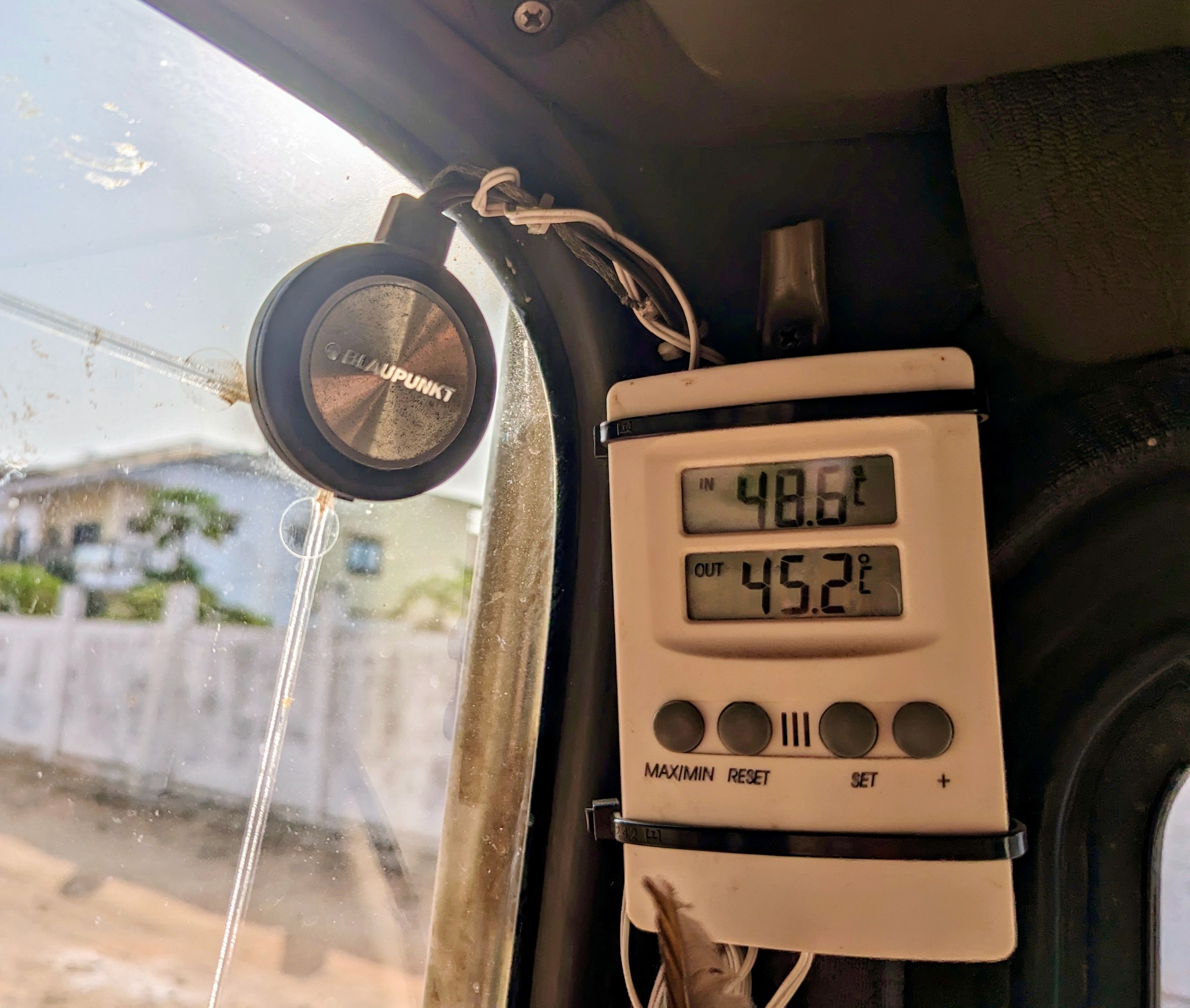 Ostwärts Richtung Benin, an den Fluss Momo, dessen Ufer für Ive, und somit für uns, nicht erreichbar sind. Aus der Idee, vor dem nächsten Grenzgang zu entspannen, wird nichts. Kaum mehr als abhängen ist in der schwülen Hitze möglich. Wie eine dicke Decke hängt seit wenigen Wochen eine Dunstglocke über uns, verdunkelt den Himmel, beeinträchtigt unser Solar power System nennenswert, wickelt uns ein in lähmenden, heißen Staub. Selbst nachts sind es mehr als 30° C im Auto. Wir schlafen bei offener Tür, bei geöffneten Fenstern sowieso. Kühlpads helfen bedingt. Ich glaube von innen heraus zu verbrennen, als würde in mir ein Feuer lodern. Schlaf stellt sich erst in den frühen Morgenstunden ein. Gott sei Dank gehen Aus- und Einreise von Toga nach Benin zügig, freundlich sowieso. Ich hätte nicht gewusst, woher ich Kraft für Grenzstress hätte nehmen sollen. Selbst Rotwein trinken bereitet wenig Freude! Doch da man bekanntlich an seinen Aufgaben wächst, werden wir den roten Südafrikaner heute Abend probieren.