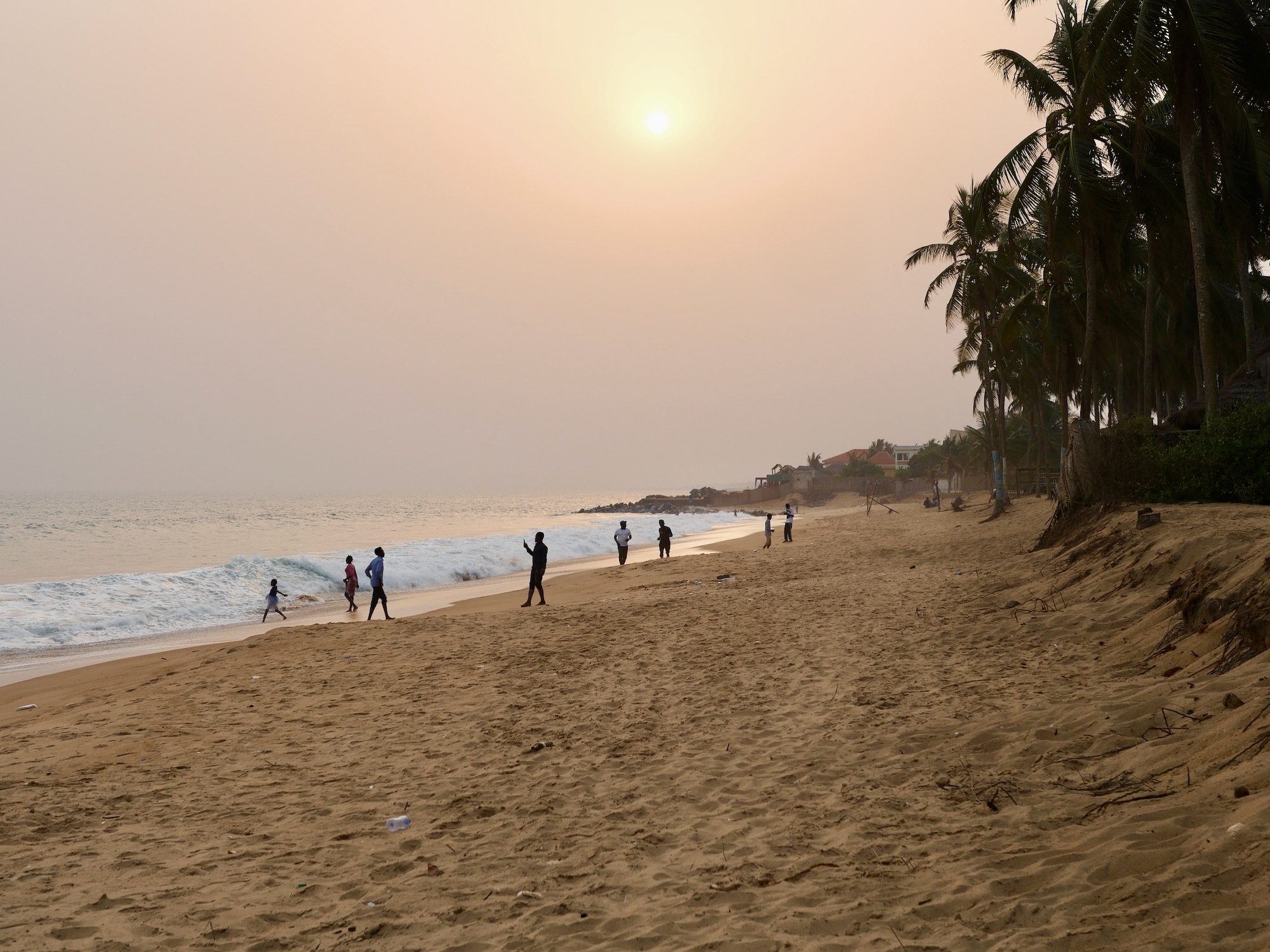 Es wird wärmer, feuchter, wir sind ziemlich geschafft. Da kommt Carl aus Passau an den Strand, fragt nach einer Zigarette. Ich überlasse ihm einen Zigarillo. Wir unterhalten uns und weil wir ihm gegenüber so freundlich sind, lädt er uns ein auf ein Bier, der Halbafrikaner. Zurück am Auto fährt Gaku, der Japaner, den wir in Conakry kennen lernten, auf den Platz. Noch ein Bier…