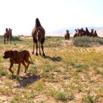 Zum ersten Mal auf der Reise befahren wir Pisten durch Grassteppe und kommen gut voran, da der Untergrund meistens weich ist. Einziger Nachteil: Der Regen hat den Boden aufgeweicht, so sind hier und dort Schlammpassagen entstanden. Aber wir meistern die Herausforderungen und kommen auch dank Peter und Margrits „roadbook“ zügig bis nach Guchin-Us, wo wir oberhalb des Dorfes campen. In Arvaikheer auf dem Markt hatten wir Gelegenheit zu einem Einkauf von frischen Produkten und so gibt es zu gegrillten Lammkoteletts Gurkensalat und Grillbrot mit würziger Zwiebel-Schnittlauchpaste – sehr lecker! Zum ersten Mal während unseres Aufenthaltes im Land kommen Mongolen, eine junge Familie auf dem Motorrad, und beschenken uns mit getrocknetem Joghurt. Vom Ort her gesellen sich Mutter und erwachsener Sohn, der mit der Familie auf Urlaub aus Kanada bei seinen Eltern weilt, hinzu. Beide sprechen gut bzw. sehr gut englisch, sie sind auf der Suche nach ihren Kühen, wollen sich erkundigen, ob wir Hilfe benötigen sowie einen Plausch halten. Natürlich gibt es auch eine Führung durch die Wohnkabine von Ive, um die Neugier zu befriedigen. Im Gegenzug werden wir in das Ger der Familie gebeten, probieren süßen getrockneten Joghurt, erhalten eine ganze Tüte als Geschenk und erfahren einiges aus dem Dorfleben: Es gibt einen Kindergarten und eine Schule mit 400 Schülern und 28 Lehrern, ein Krankenhaus, Shops und Tankstelle sowieso; die freundliche Dame war Russischlehrerin, hat in Moskau studiert, ihr Mann in Irkutsk. Jetzt sind beide im Ruhestand, leben Sommer wie Winter im gemütlichen Ger und haben 10 Kühe. Wir wollen noch Bier kaufen bevor wir Guchin-Us verlassen. Auf dem Weg zum Shop versenke ich Ive fast in einer Schlammpassage, aber halt nur fast und es gelingt Jürgen mit seiner langjährigen Erfahrung aus der Landschaft auf dem Trecker Ive zu befreien. Wir queren die Senke der Gobi-Seen. Seen sehen wir nicht, was wir sehen wollen wir nicht sehen, es sind immer wieder tiefe und lange Schlammpassagen, die wir irgendwie umfahren, durchfahren bzw. was auch immer müssen. An eben solcher Stelle, die ich/Marion gerade gemeistert habe, stellt sich die Frage: to see or not to see? Ein Landcruiser hat sich saublöd festgefahren. Wir sind nett und freundlich, evtl. auch mal auf Hilfe angewiesen und fahren ein Stück zurück und packen unser Equipment aus. Nach ca. 25 Minuten darf ich/Marion mit Ive´s Hilfe den Landcruiser aus seiner misslichen Lage befreien. Aber auch vor uns liegen noch zahlreiche Schlammpassagen, die schlimmsten sind jedoch passé, die Landschaft wird trockener. Grassteppe geht in trockene Steppe über. Große Herden von Schafen, Ziegen, Rindern, Kamelen und immer wieder Pferden – es gibt deren mehr als Menschen in der Mongolei – bringen Abwechslung in die Landschaft, anders als die Gers, die nur äußerst spärlich in der Natur verteilt sind. Die Berge des Gobi Altai rücken näher und zaubern wunderbare Bilder in den Blick. Trotz der Widrigkeiten des Tages erreichen wir früh unseren Etappenplatz bei Bogd am Rande des Gobi Altai. Es wird ein wunderschöner Abend: grillen, Bier, Sonne, die auf ihrem Weg nach Westen unsere Kulisse in immer wieder neue Farben taucht. Es gibt kein Internet und so müsst ihr mit weiteren Reiseinfo wieder etwas länger warten, denn wir erreichen auch die nächste Siedlung, Gurvantes, nur bis auf knapp 50 km, zu schlecht ist die Piste, um die 230 km durch den Gobi Altai und über den Trans Altai Gobi an einem Tag zurück zu legen. Wir kommen der Wüste Gobi langsam näher: Saxaul wird das dominierende Gewächs, Trampeltiere die vorherrschende Tierart und vermehrt taucht Sand auf. Immer wieder wird unser Blick in unendliche Weiten entführt, wir sehen den ganzen Tag keinen Menschen. Trotzdem sind wir gewiss, dass es den Homo sapiens auch hierher verschlagen hat: hier und da erkennen wir Gers in der Ferne, am Wegrand finden sich Überreste von KFZ, meist sind es Reifen bzw. Teile davon und immer wieder markieren Flaschen in unterschiedlichen Zerstörungsstadien den Pistenverlauf. Auch gerne werden Schuhe zurückgelassen, das ist verständlich zieht es einem bei den schlechten Wegen doch glatt die Schuhe aus. Unsere Durchschnittsgeschwindigkeit nach Gurvantes liegt deutlich unter 20 km/h…