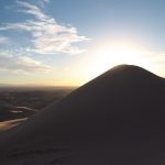 Per Füßen, Pfoten und Reifen erkunden wir die Gegend. Wie könnte es anders sein, Jürgen spielt natürlich auch noch im Sandkasten. Spaß im Sand? Das braucht vier Reifen finde ich/Marion! Während wir uns mit der Betrachtung der Landschaft begnügen und die Touristenströme betrachten, die teils mit Schlitten bzw. Snowboards beladen die Düne erklimmen oder es beim Versuch belassen und dabei ihre Spuren hinterlassen, ist Minouk der Ansicht, dass umfangreichere landschaftsgärtnerische Gestaltung von Nöten ist: Er buddelt Büsche aus, versetzt Sandhügel, gräbt tiefe sowie lange Löcher und dezimiert den Bestand an Eidechsen. Ab und an vertreibt er noch Kamele bzw. Pferde von seinem Grundstück. Wir besteigen natürlich – wie es sich gehört – den mehr als 200 m hohen Sandhaufen und das gleich zweimal. Bei unserer Erstbesteigung ist es so stürmisch, dass ich die Kamera im Auto lasse. Sie schwächelt ohne hin, wie der aufmerksame Bildbetrachter evtl. festgestellt hat. Der Anblick von der Höhe ist jedoch so atemberaubend schön, das wollen wir nicht nur in Gedanken festhalten und so erklimmen wir den Gipfel am nächsten Abend erneut. Grenzwertig, hatten wir doch schwere Beine vom Tag zuvor und von den Motorradausflügen! Nun, wir genehmigen uns einfach noch einen Ruhetag, denn auch das Wetter ist einfach zu schön! Einziges Manko: das Bier geht zu Neige und ach ja: Internet gibt es auch keins! Wir brechen auf nach Bayan Zag.